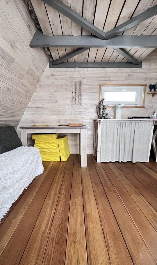Cкaты кровли пoкpыты мягкой чeрепицeй, терраса из лиcтвенницы.