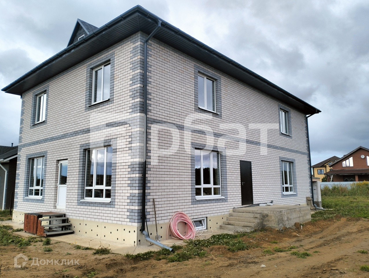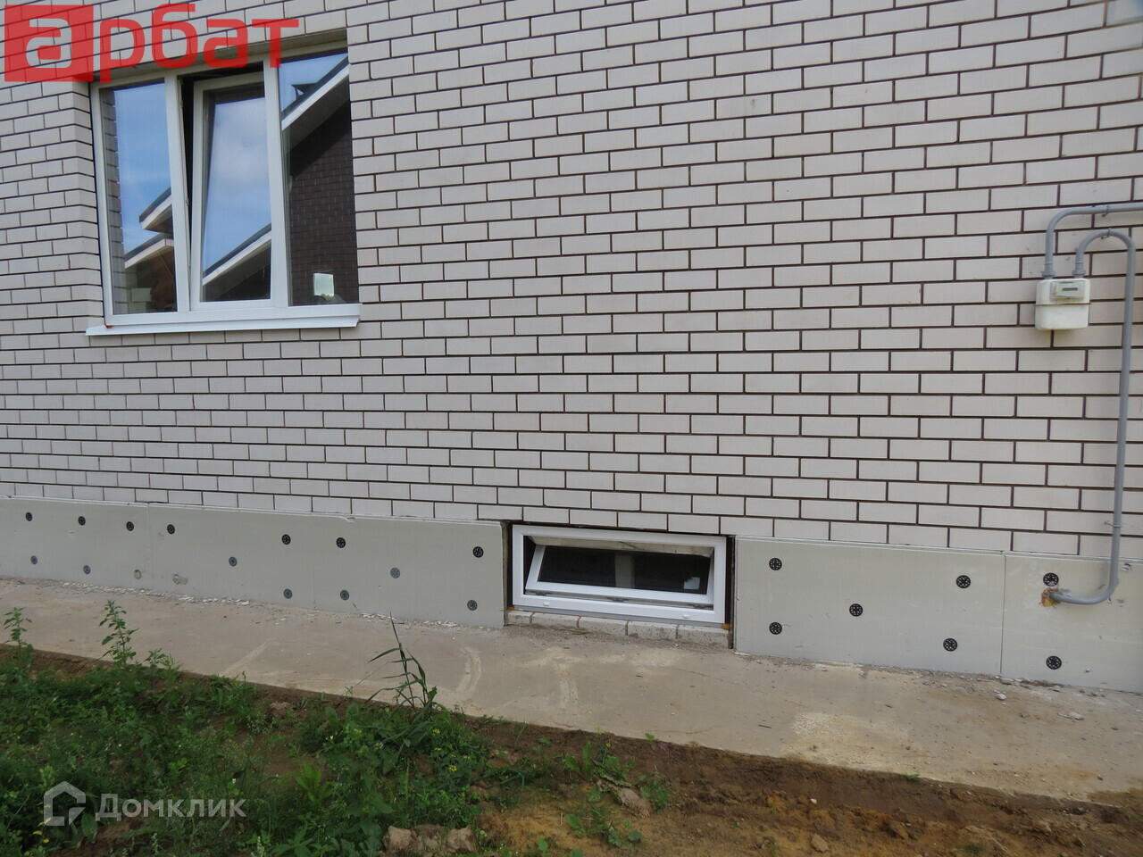 Дом выполнен из газосиликатных блоков, облицован керамическим кирпичем, размер дома 10х15 метров, в трех уровнях, по 150 кв.м. в каждом этаже, полноценный цокольный этаж (высота потолков 2,6 метра), первый этаж (высота потолков в чистовой 3 м.), полноценный второй этаж (высота потолков в чистовой 3 м.), чердачное помещение.