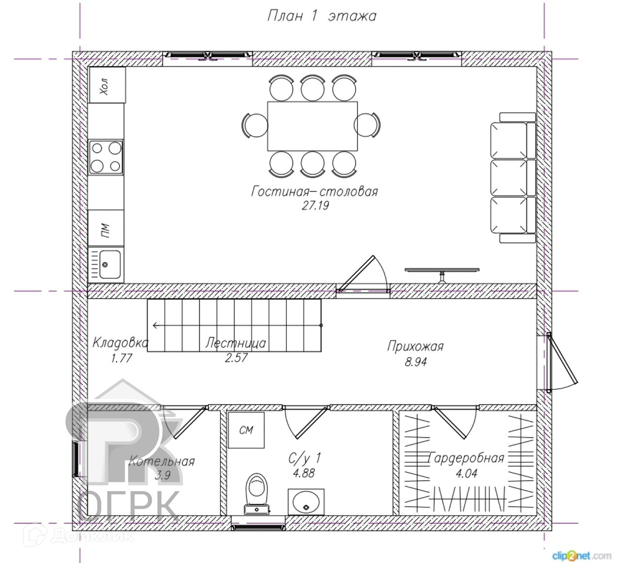 - на 1 этаже предусмотрена большая кухня-гостиная, санузел, гардеробная, бойлерная;