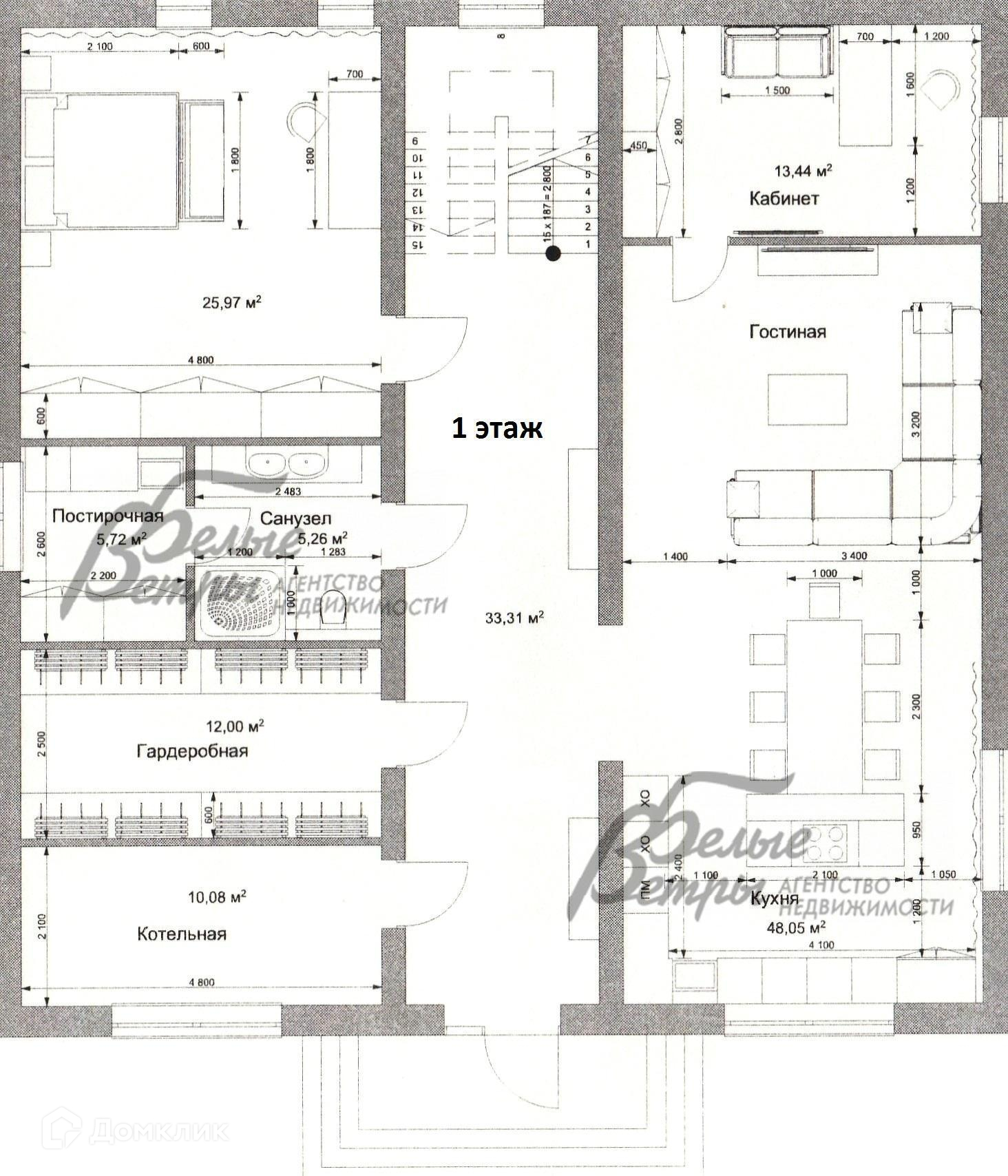 1-ый этаж: 168 кв.м в том числе: крыльцо 14 кв.м, внутрь дома ведет просторный коридор площадью 33 кв.м и в конце которого находится лестница на 2й этаж, а по обе стороны расположены гардеробная 12 кв.м и котельная 10 кв.м у входа, далее большой комплекс санузел/душ и постирочная, общей площадью 11 кв.м и огромная спальня 26 кв.м. Справа от входа находится кухня-столовая-гостиная площадью 48 кв.м и кабинет 13 кв.м.