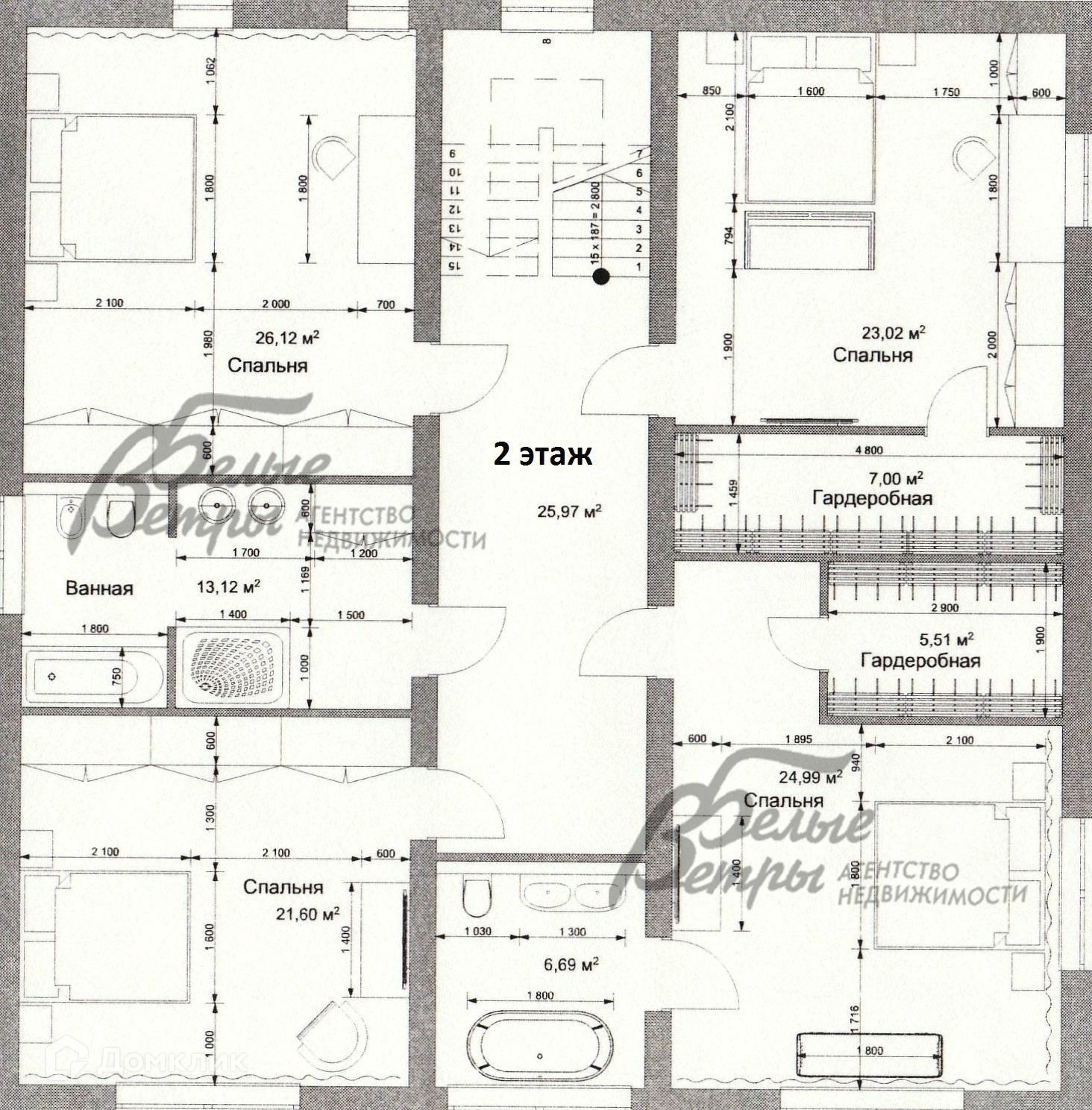 2-ой этаж: 154 кв.м: выход с лестницы в просторный коридор размером 26 кв.м, на этаже расположены всего 4 спальни, из них 2 спальни 26 кв.м и 22 кв.м, спальня 23 кв.м со своей гардеробной размером 7 кв.м, а также мастер-спальня 25 кв.м со своим санузлом с ванной 7 кв.м и гардеробной 6 кв.м. На этаже есть большой общий санузел с душевой и ванной размером 13 кв.м.