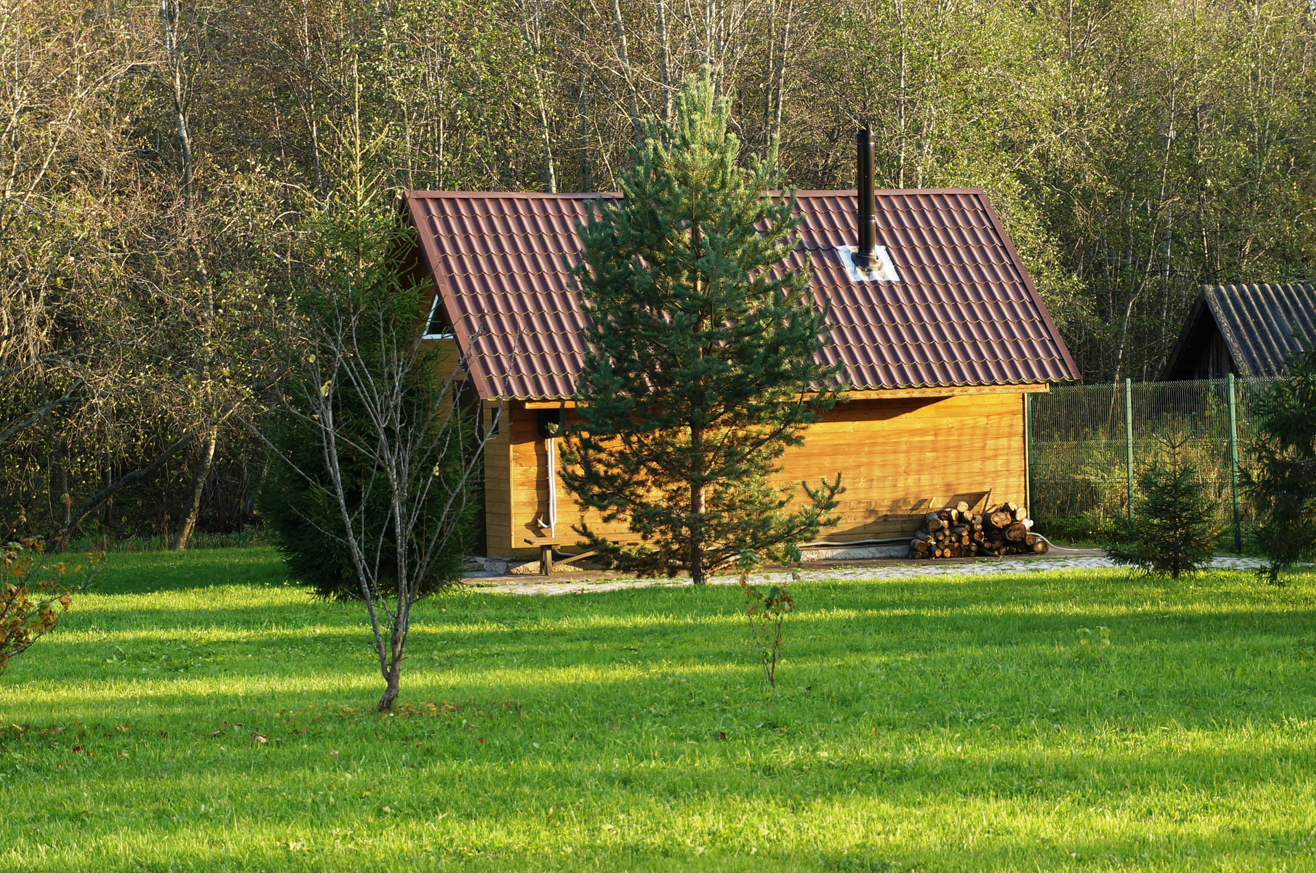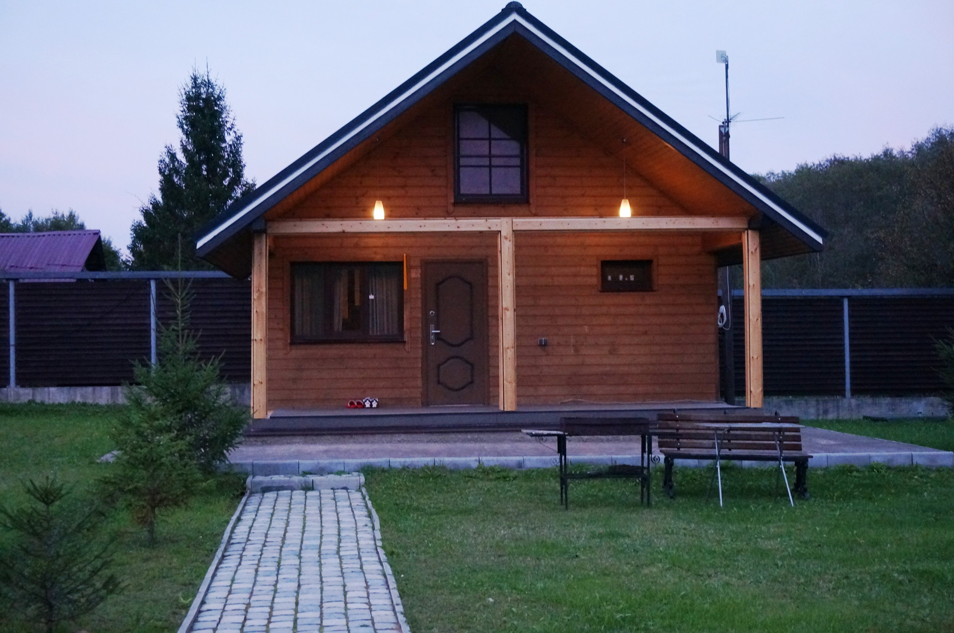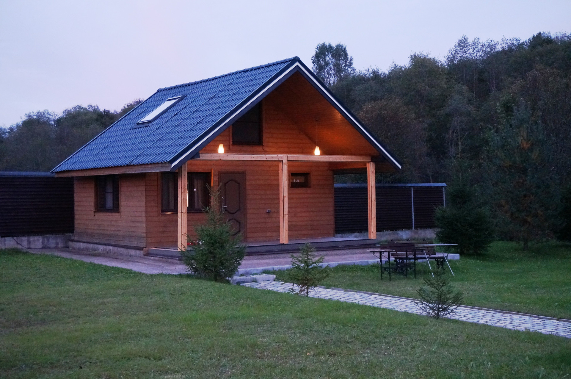 Изготовлен по каркасной технологии с двойной системой утепления, снаружи обшит деревом (блок-хаус). Крыша из финской металлочерепицы.