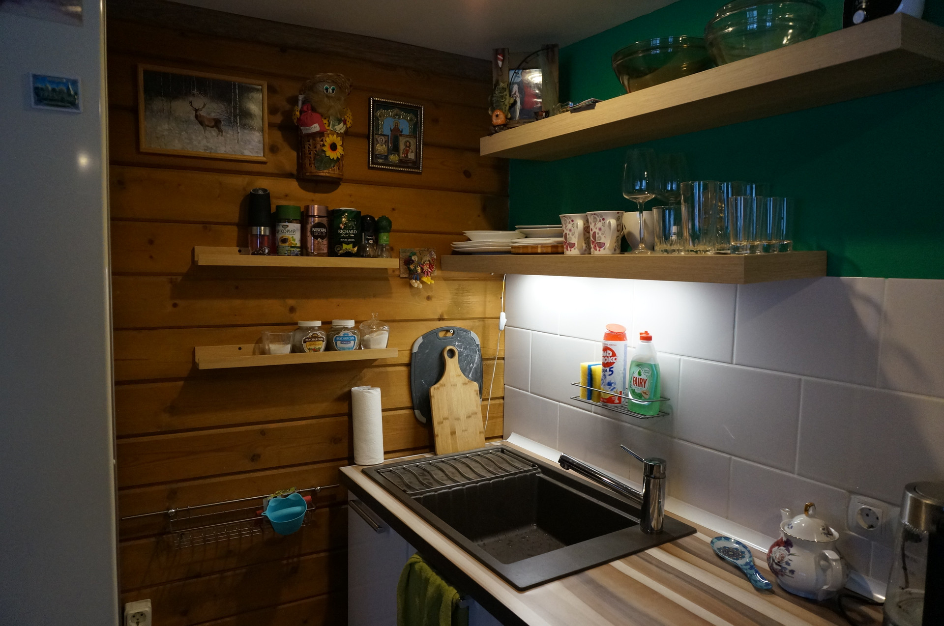 В парную ведет дверь Harvia из термостойкого стекла. Для ценителей правильного пара установлена финская печь Kastor, заполненная камнями: жадеит и карельский малиновый кварцит. Зона топки отделана камнем (зеленый змеевик), в стену встроено панно с подсвеченной гималайской солью. Полки и стены выполнены из абаши и липы.