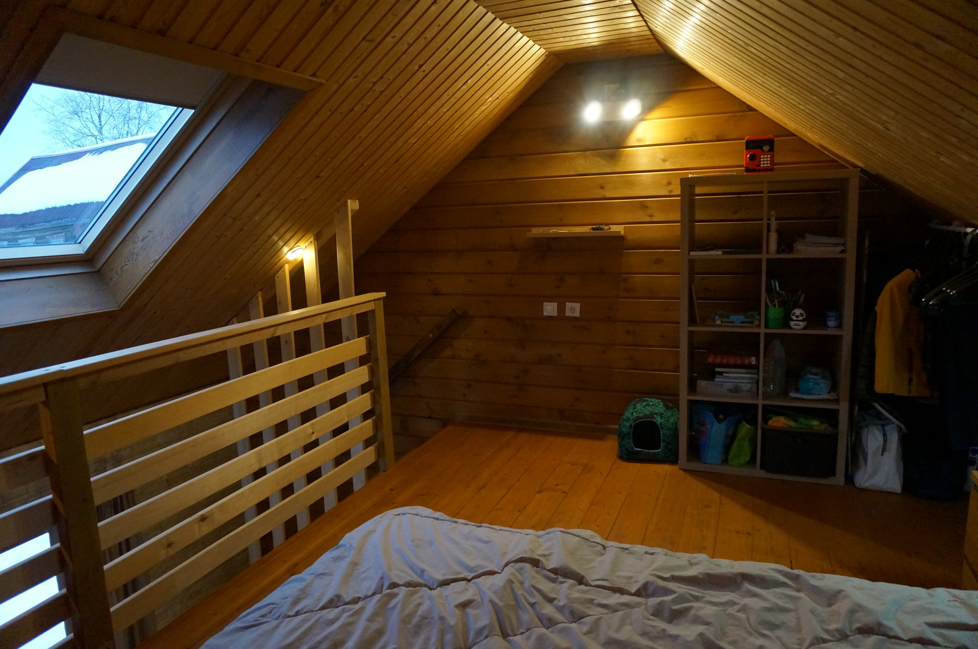 На втором этаже комната с двуспальной кроватью, гардеробной зоной, большим видовым и мансардным окном. На этаж ведёт комбинированная лестница – деревянные ступени на металлическом каркасе.