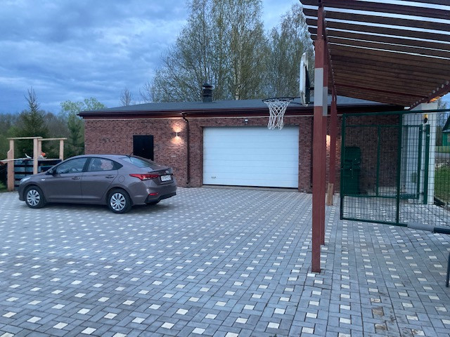 Оборудован подъемными секционными воротами и состоит из помещения гаража 49м2 и жилого помещения с тамбуром, комнатой и санузлом площадью 21м2.