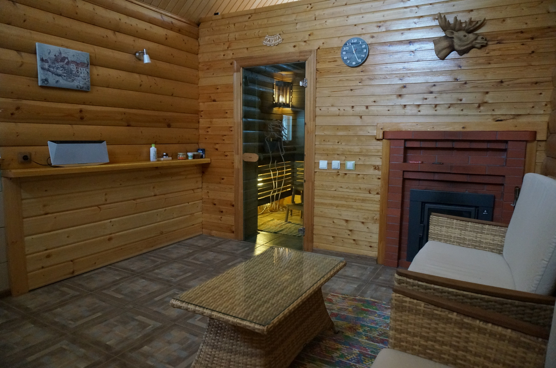 Внутри: зона отдыха – с дизайнерским освещением, отделкой из керамики, камня и дерева разных пород.