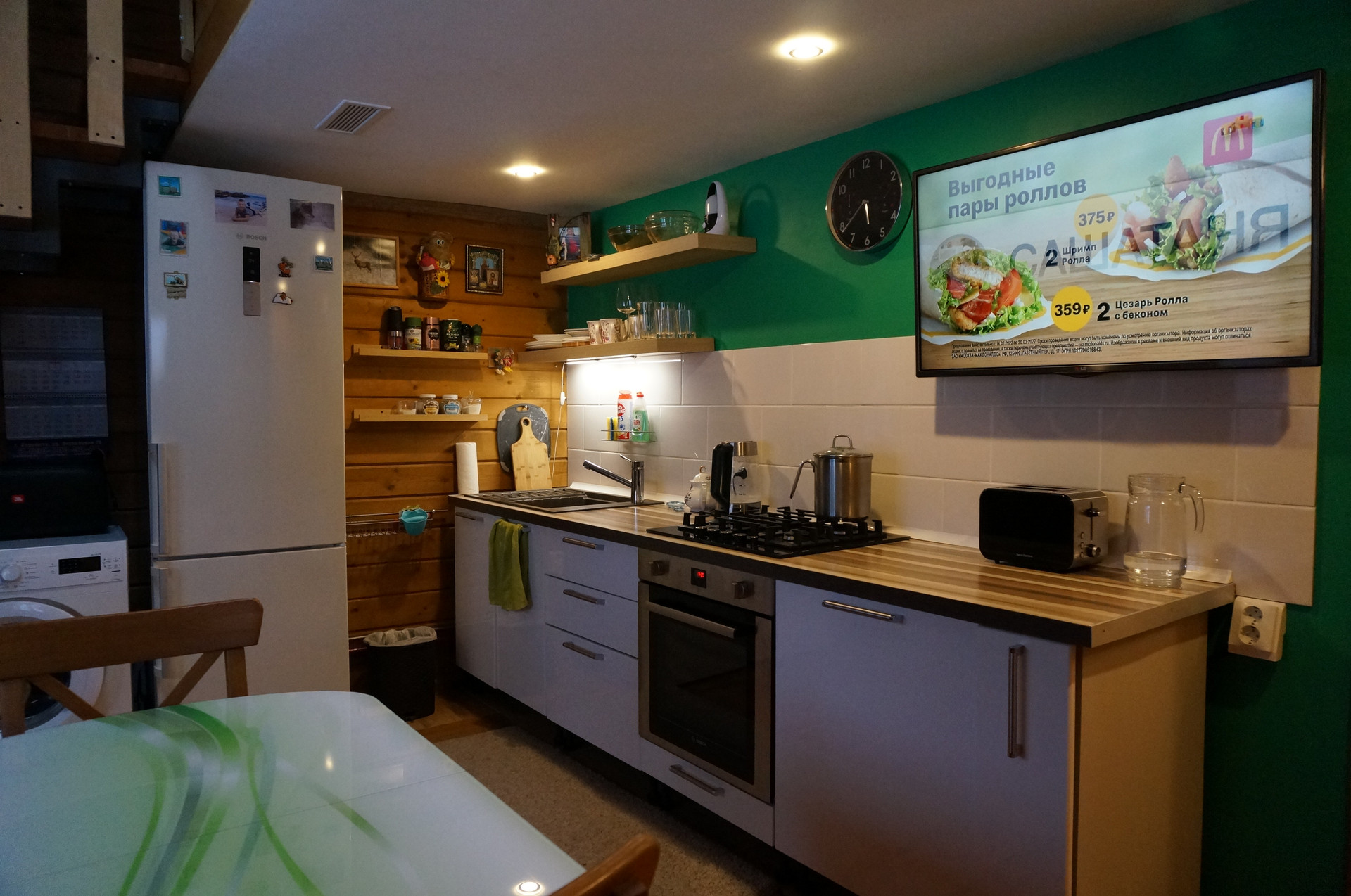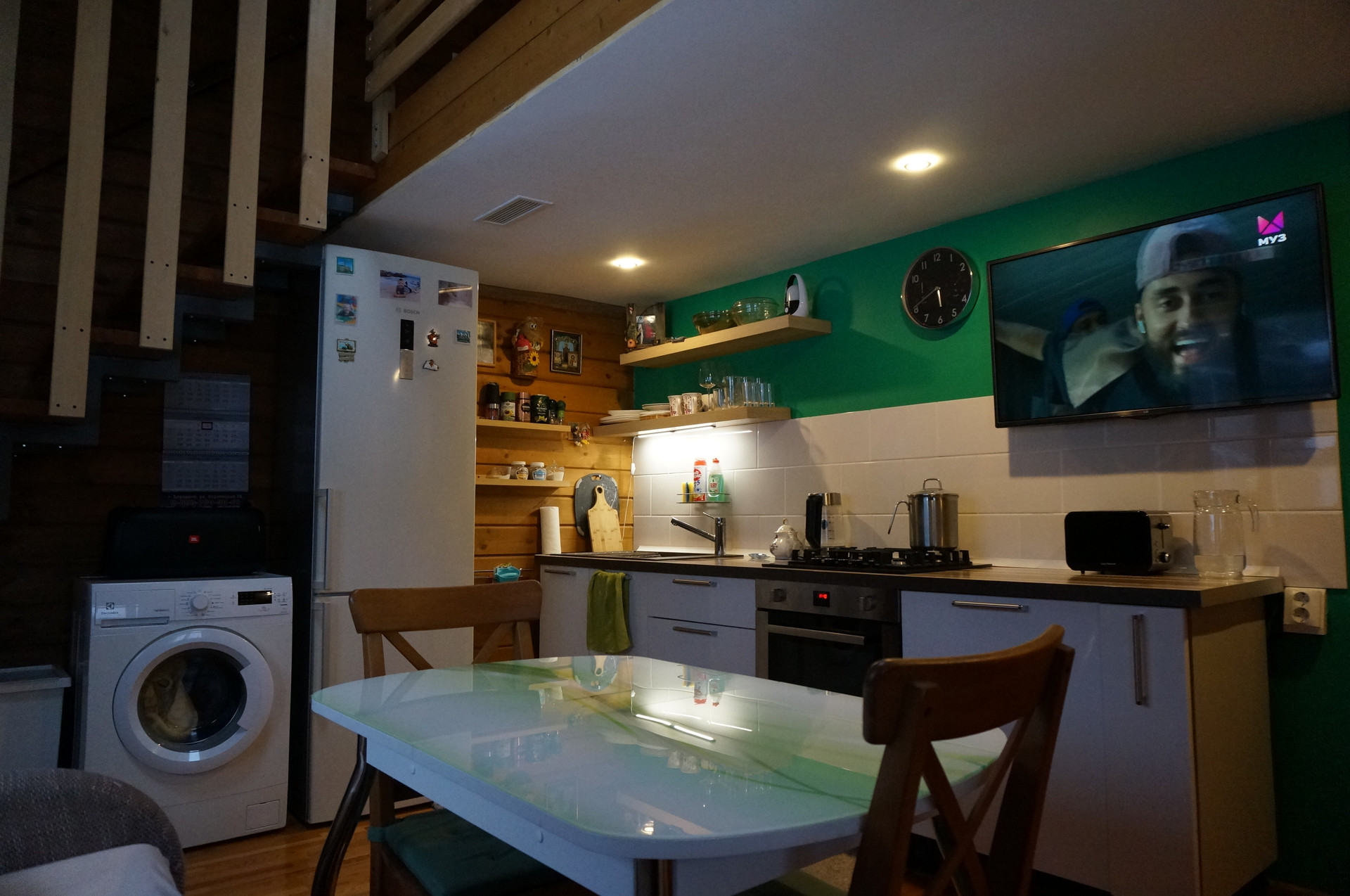 На первом этаже, площадью 33 м2, полностью оборудованная кухня-гостиная и раздельный санузел с ванной. Техника – холодильник, газовая плита, духовка марки BOSCH, стиральная машина Electrolux, а также большой телевизор с системой SMART. В кухонной зоне фартук из керамической плитки и мойка из искусственного камня.