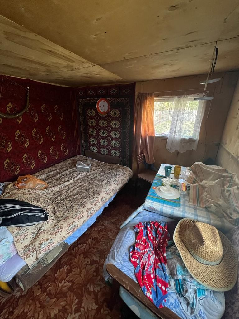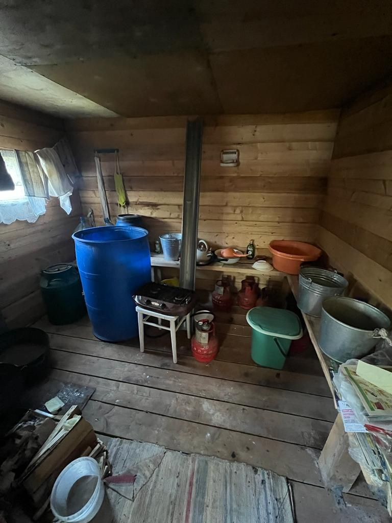 В доме две комнаты, мебель, лестница, буржуйка.