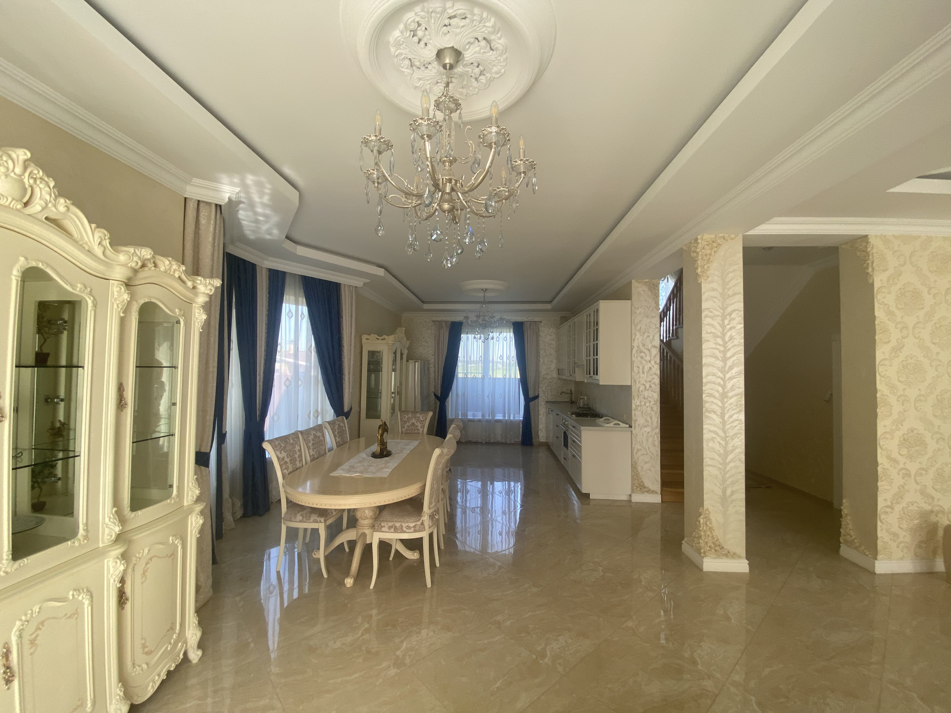 1 этаж - прихожая, просторная зонированная зона гостинной, кухни и столовой, санузел, техническая комната;