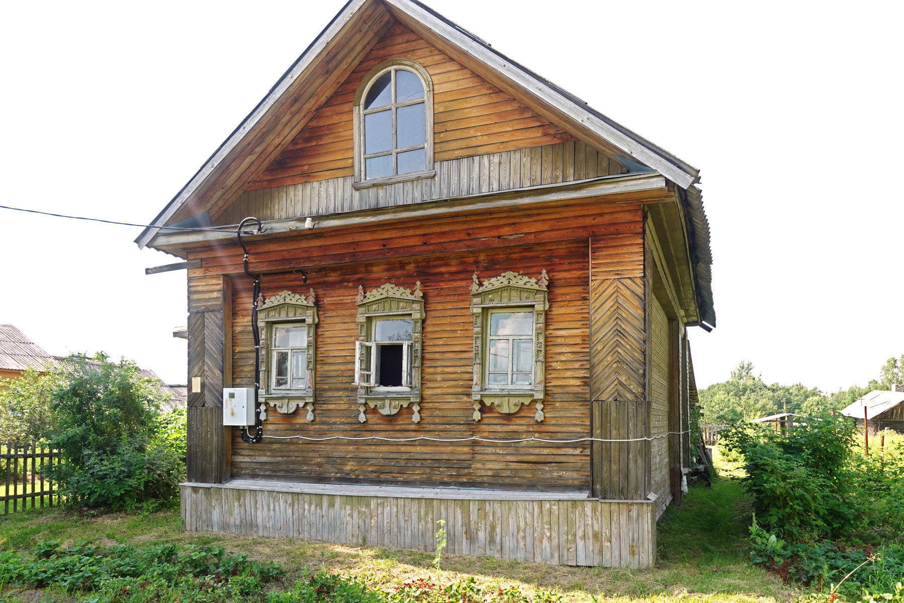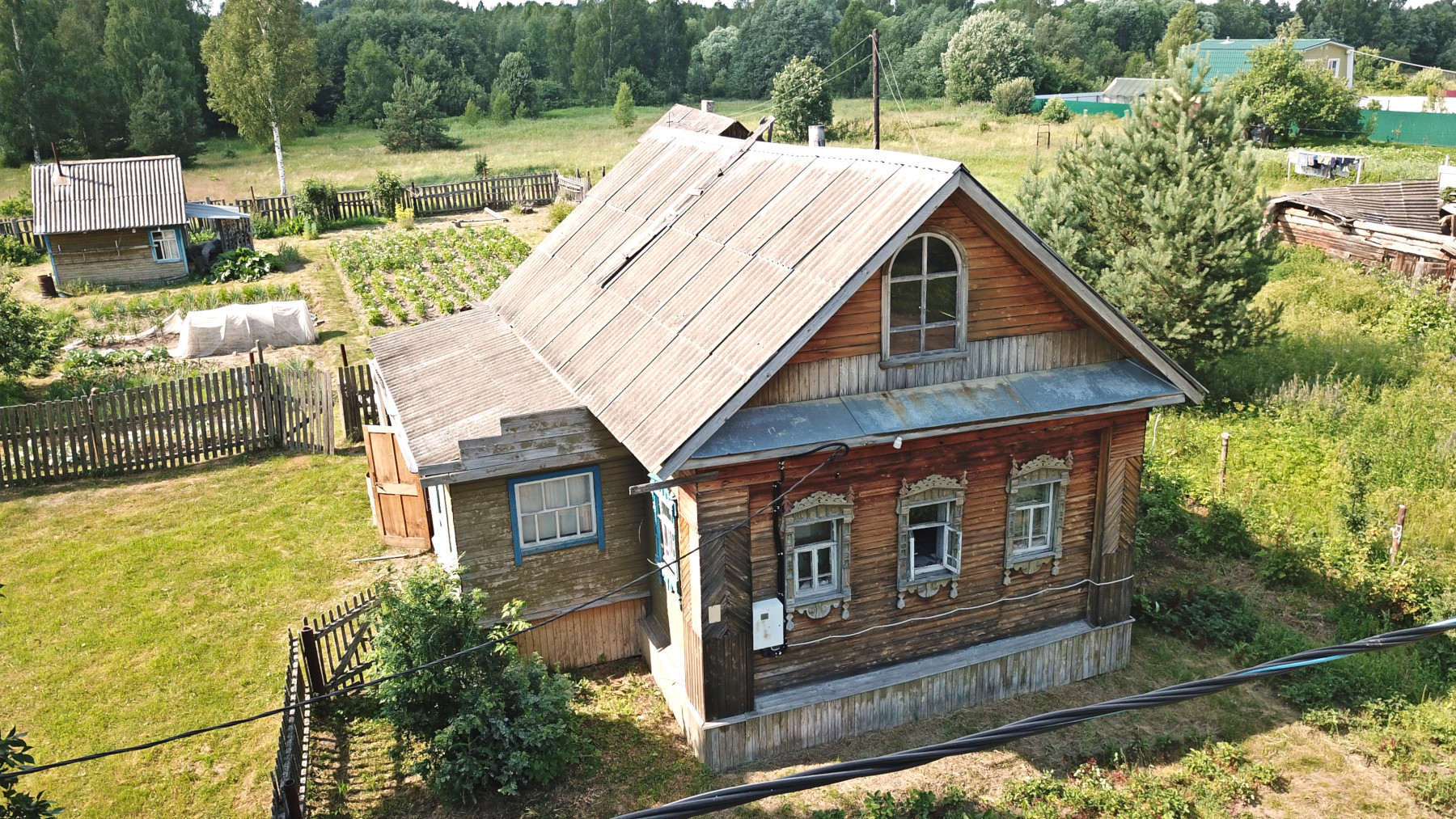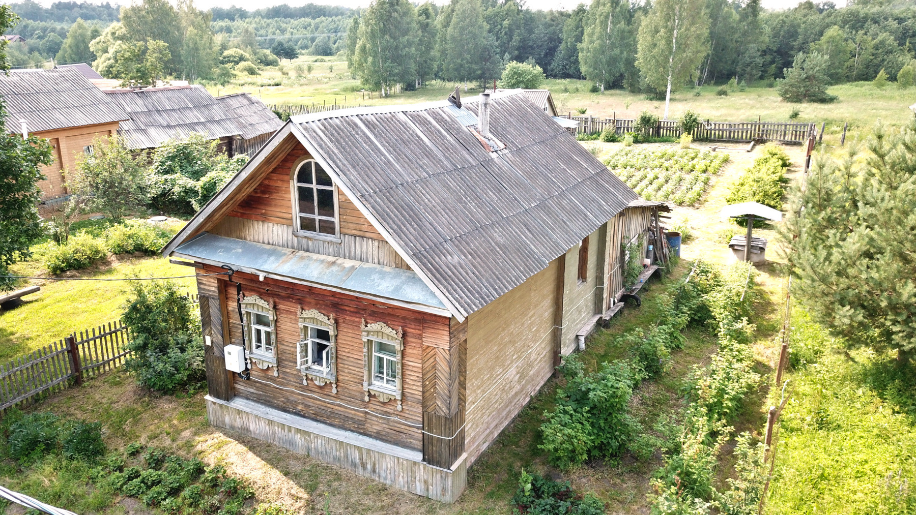 Бревенчатый дом традиционной архитектуры с резными наличниками, обшитый тёсом, общей площадью 48 кв.м. Фундамент – кирпичная лента. Бревна в отличном состоянии, нижние венцы заменены. Отделка выполнена деревом, без использования пластика. Внутри дома центральная комната, кухня и просторная веранда. Хозяйственный двор переделан и используется под гараж. Печное отопление («шведка», печь-камин), колодец с питьевой водой на участке, рядом с домом. Возможность подведения магистрального газ, труба проходит по границе участка.