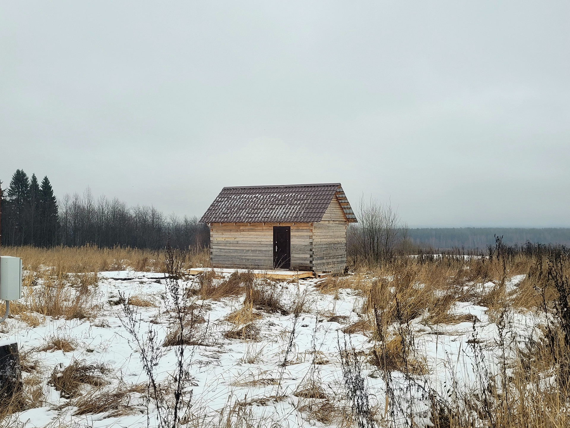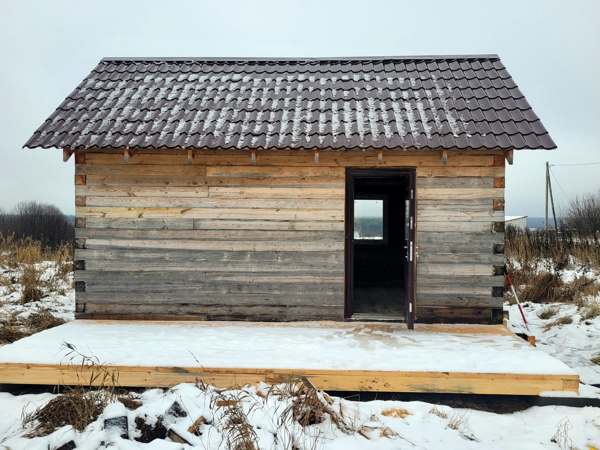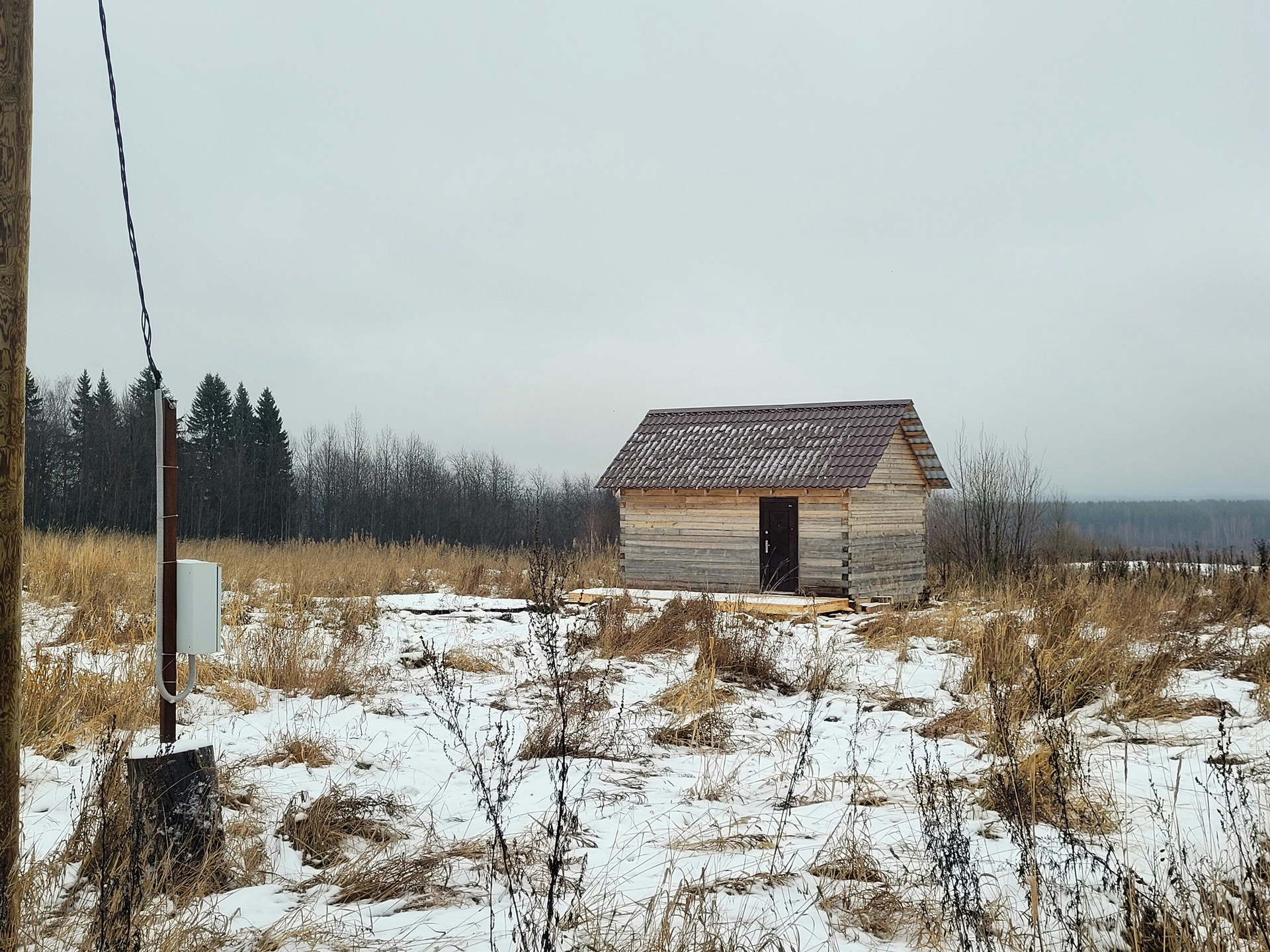 На участке жилое строение на винтовых сваях, из бруса 6х4 под крышей ( металлочерепица). Качественное соединение венцов (теплый угол).