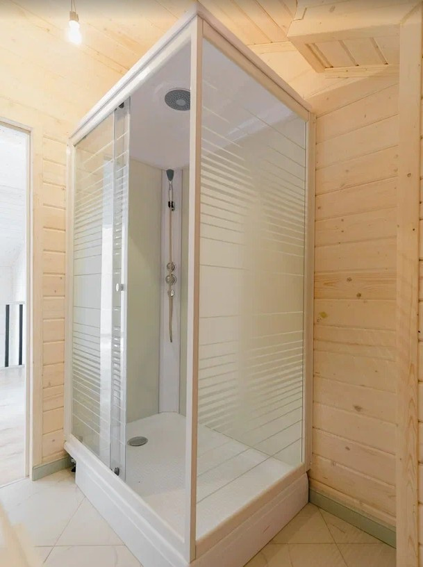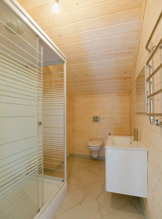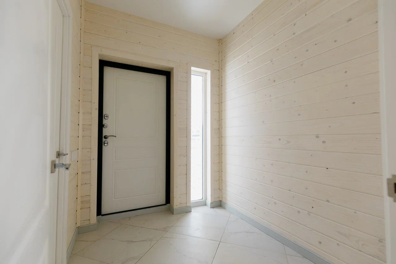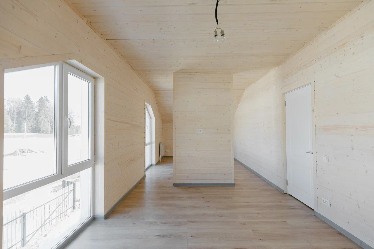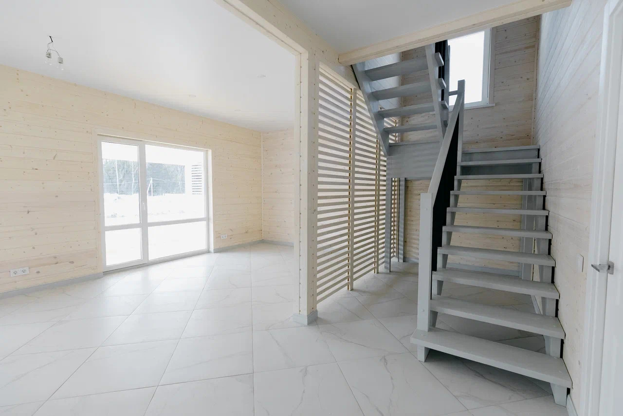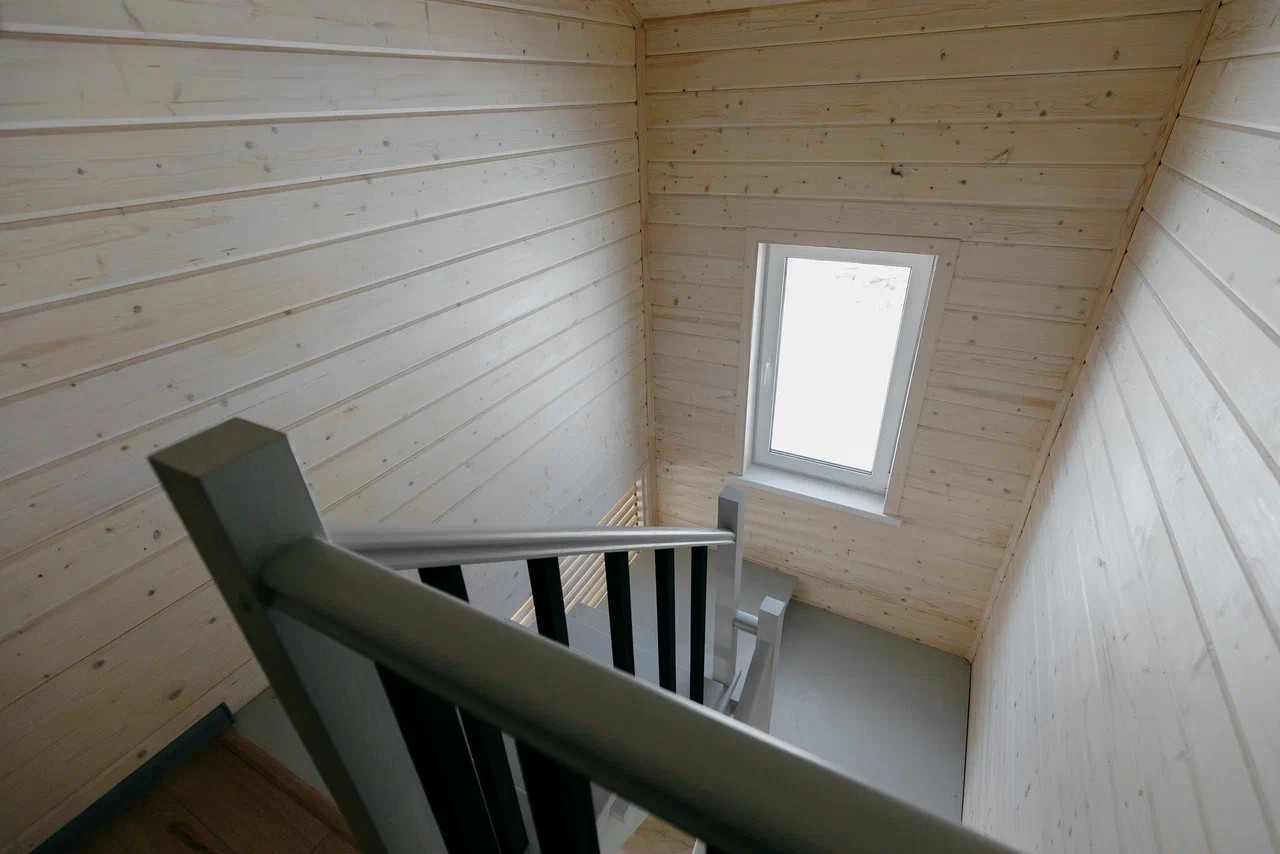 Фундамент - монолитная утепленная плита с ребрами жесткости, стены выполнены из бруса и каркаса, наружная и внутренняя отделка из имитации бруса, крыша металлочерепица, установлены панорамные теплые двухкамерные стеклопакеты в 7-ми камерном профиле Rehau, по первому этажу выполнены теплые водяные полы, натяжные потолки с точечными светильниками, деревянная лестница, скрытая электрика выполнена по ГОСТУ в металлорукаве с ПВХ изоляцией, заземление, в перегородках и межэтажном перекрытие сделана шумоизоляция, сан. узлы отделаны плиткой и установлена сантехника.