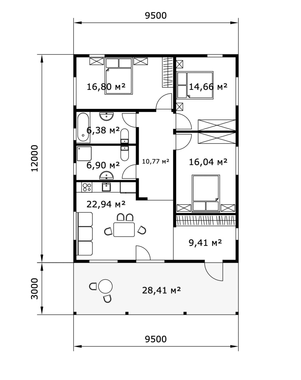 В доме: прихожая, просторная кухня-гостиная с выходом на большую крытую террасу, три спальни, два санузла.