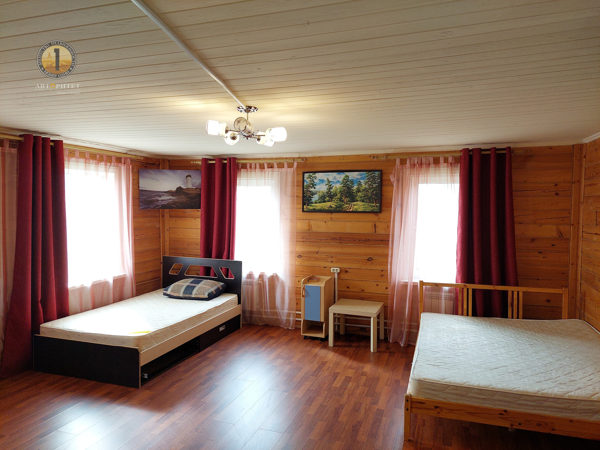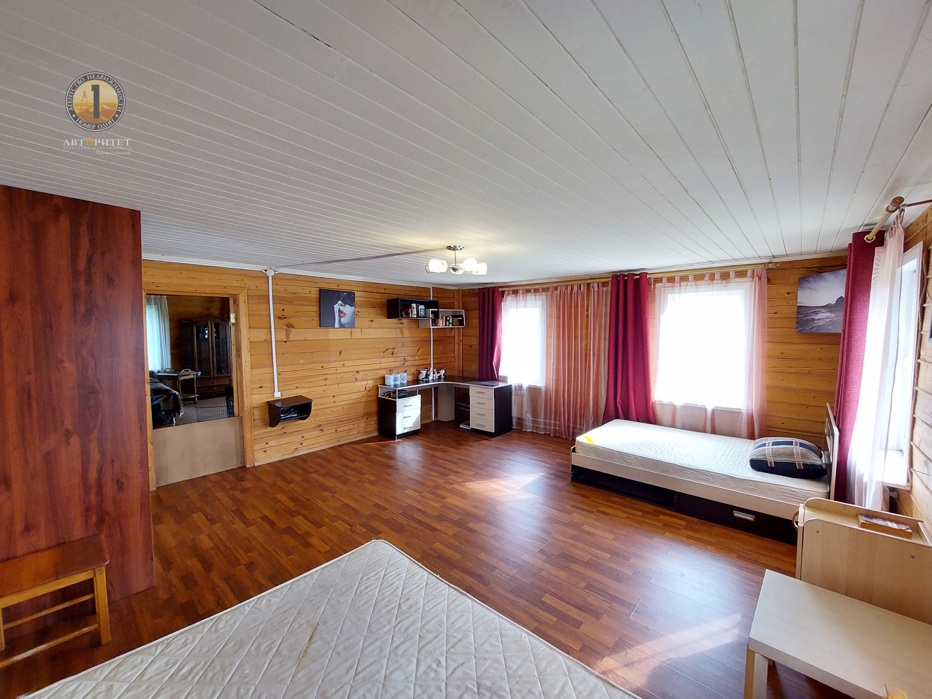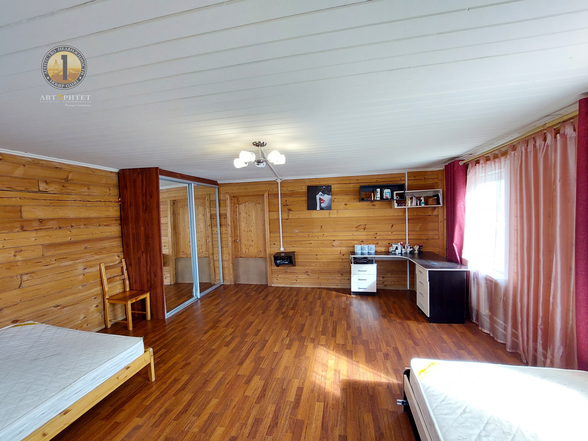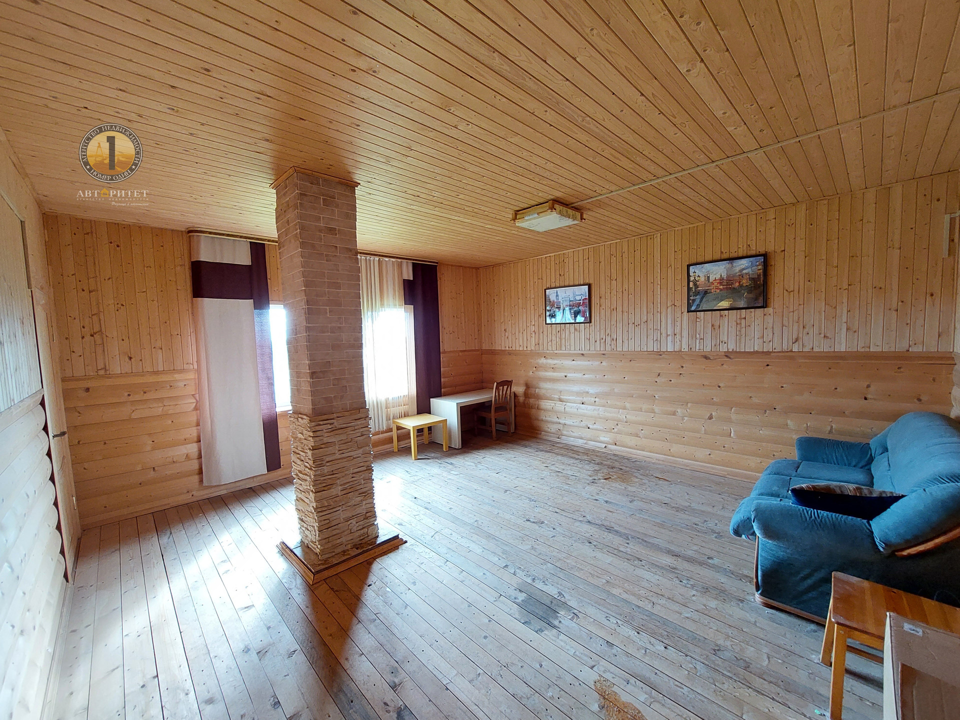 Дом возведен из бруса на ленточном фундаменте размером 12х12 метров. Снаружи обшит сайдингом, внутри вагонкой и блок-хаусом, установлены стеклопакеты.