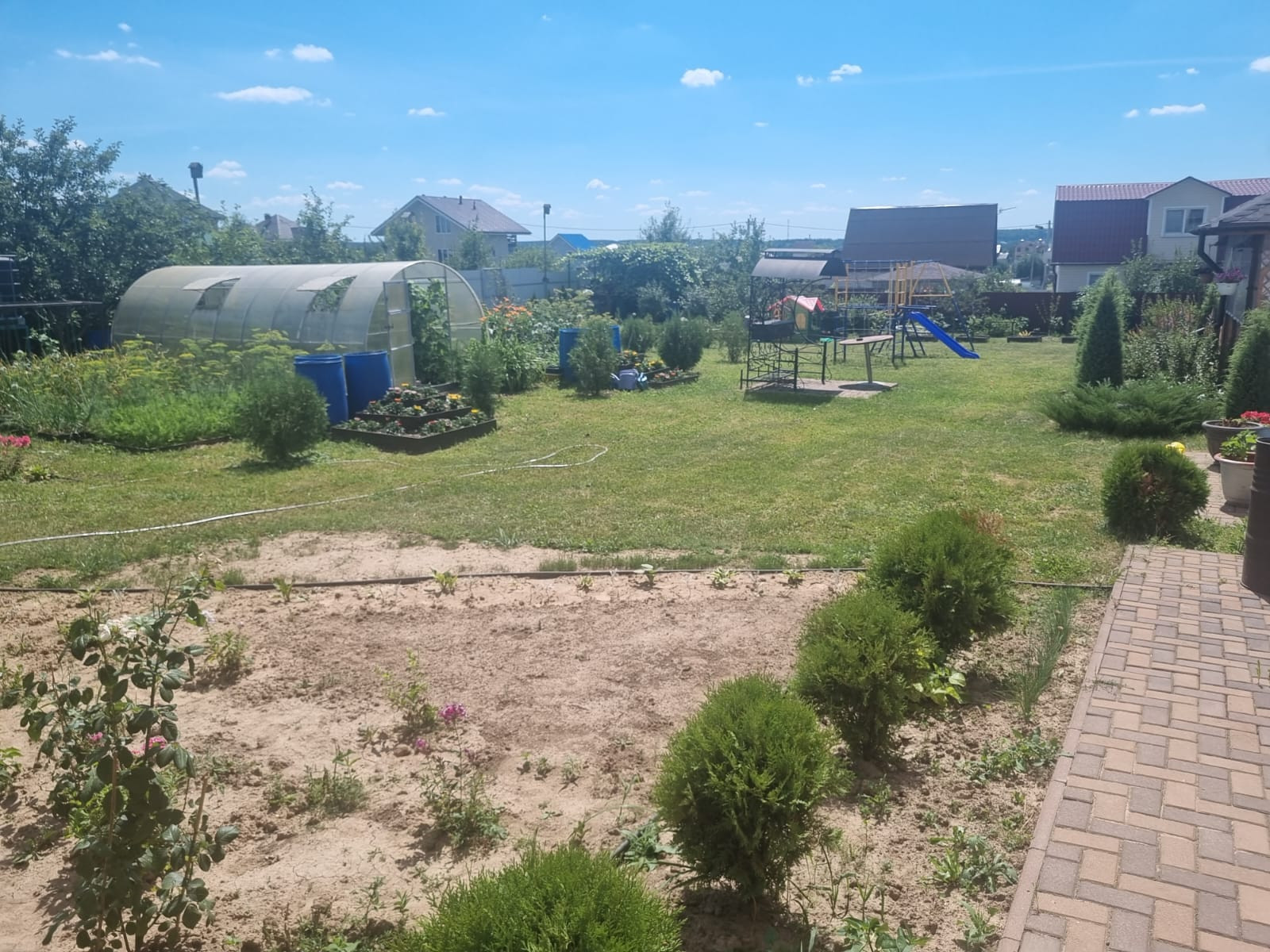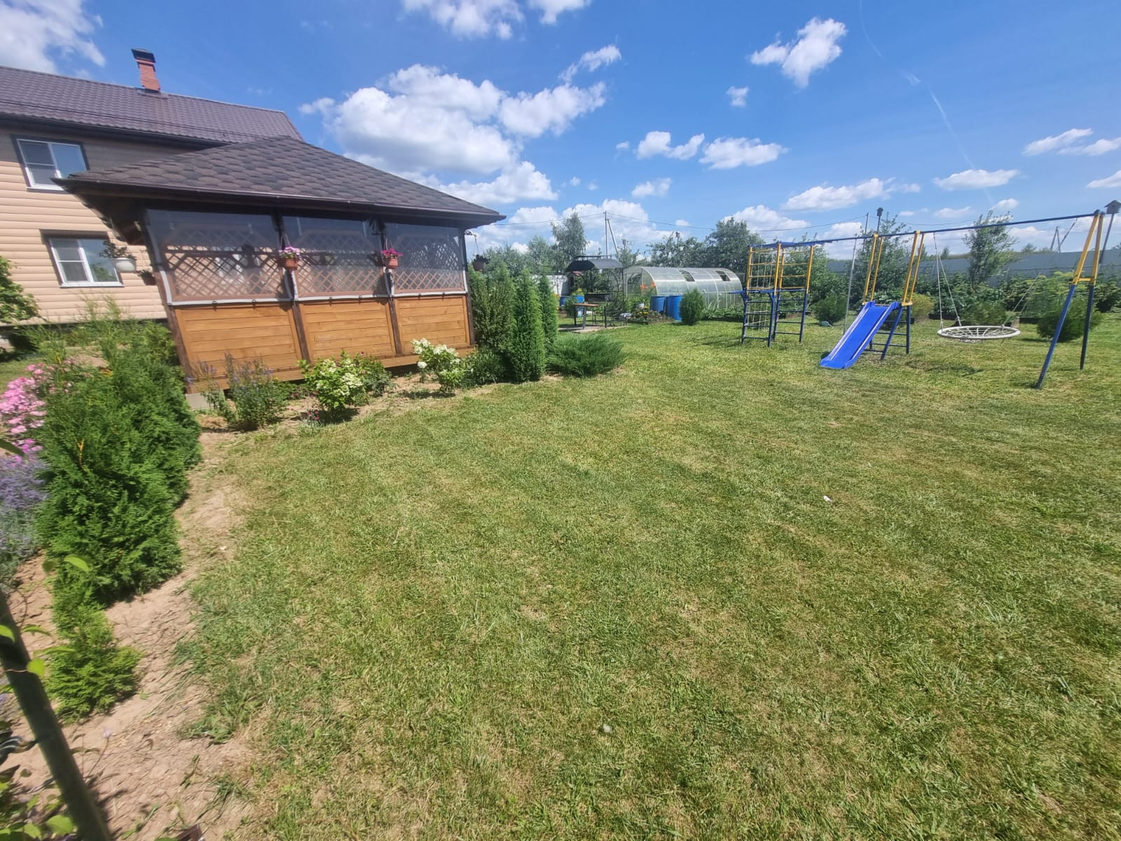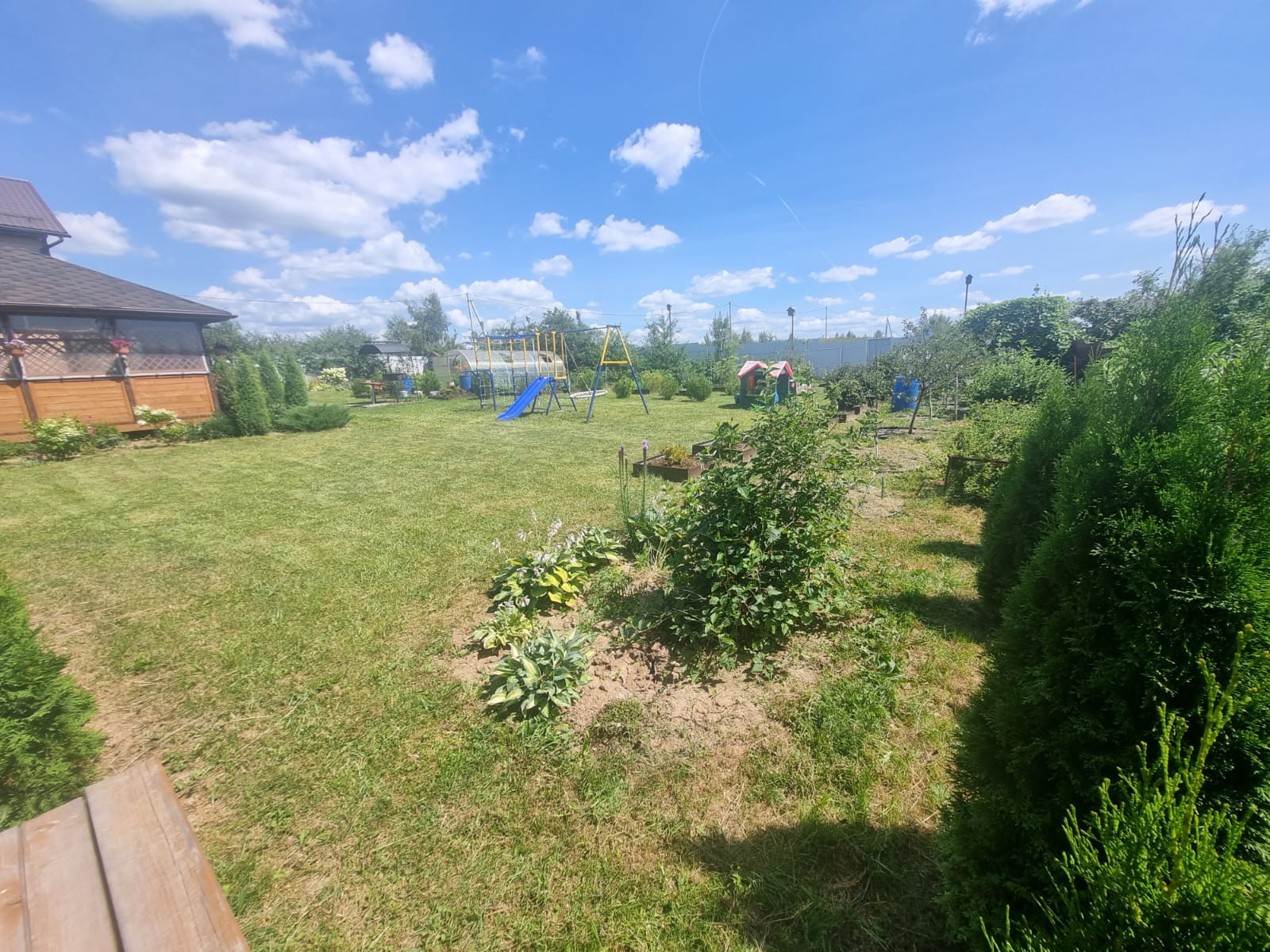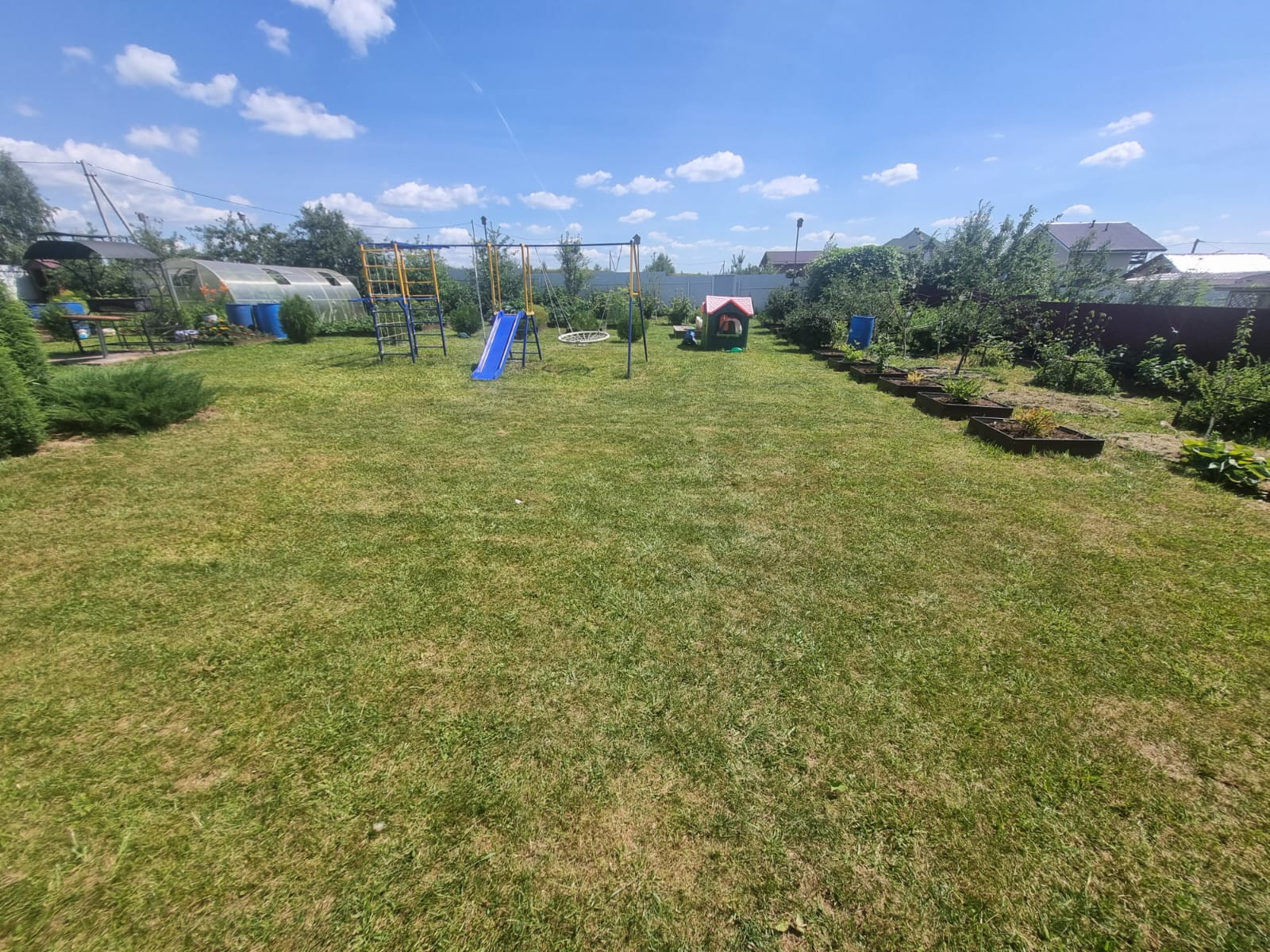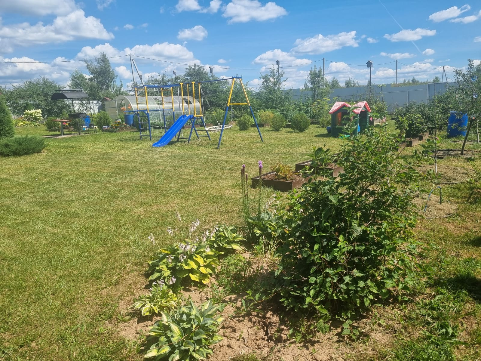 На участке расположены: детская игровая зона, мангальная зона, зона для каркасного бассейна, зона с качелями под навесом из винограда (сорт «Изабелла), беседка с мягкими окнами (4,25 м на 4,25 м), 2 бытовки ( 6 на 2.3 метра и 2 на 2 метра), колодец, скважина, септик-кольца, переливной; теплица с автоматическими форточками и капельным поливом (6 на 3 метра), оцинкованные грядки коричневого цвета в количестве 8 штук, по периметру: 5 яблонь, 3 груши, 3 черешни, 3 вишни, 9 слив, кустарники крыжовника, смородины, малины и ежевики, а также большое количество туй и можжевельников, цветов.