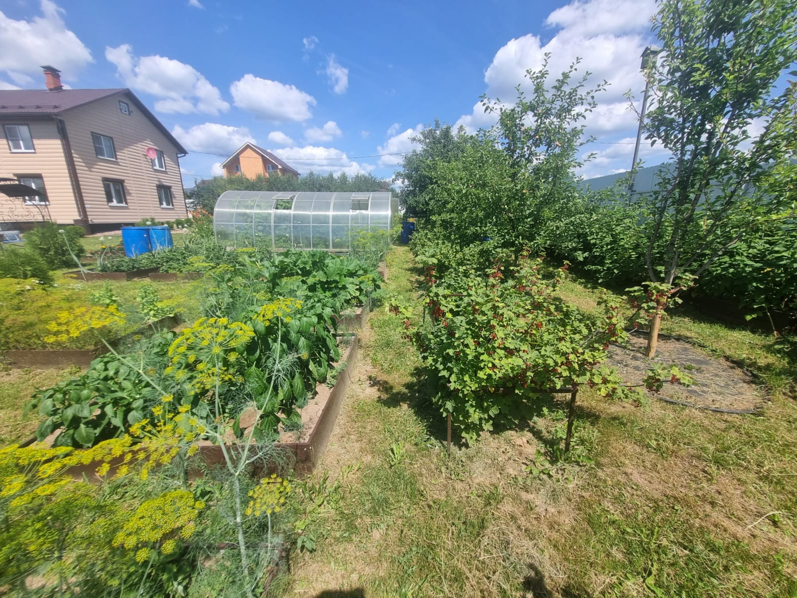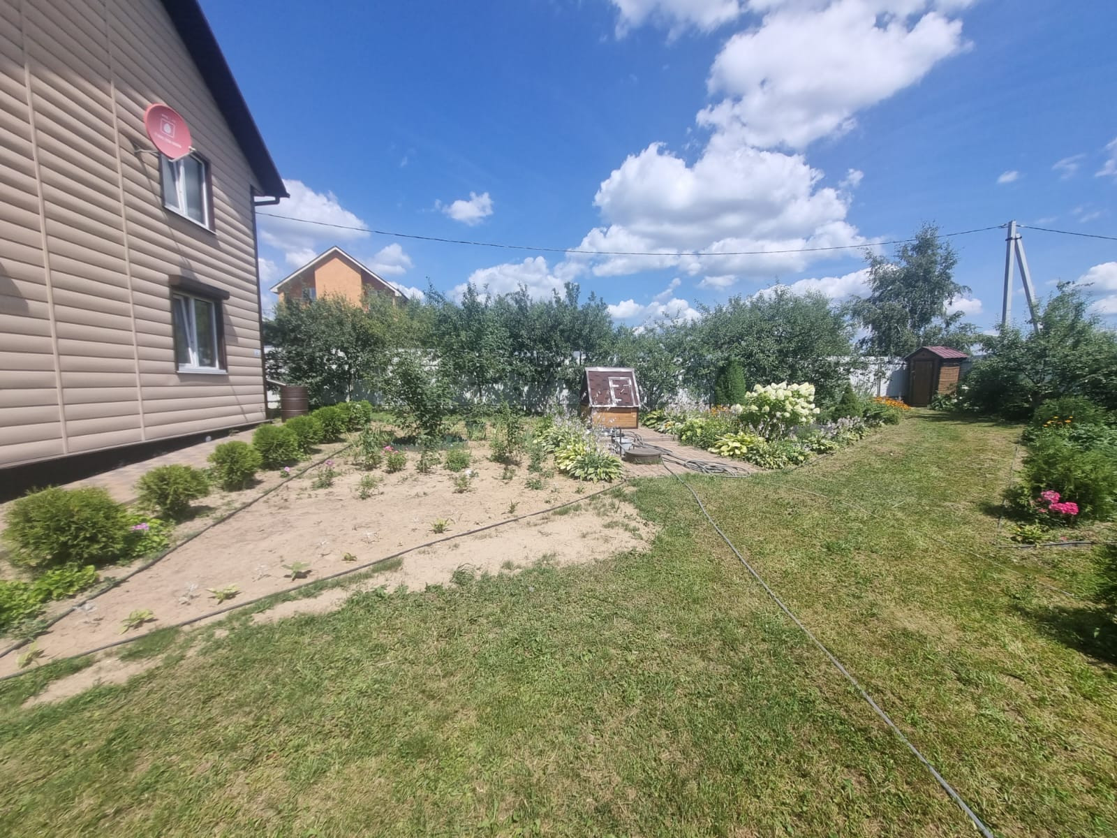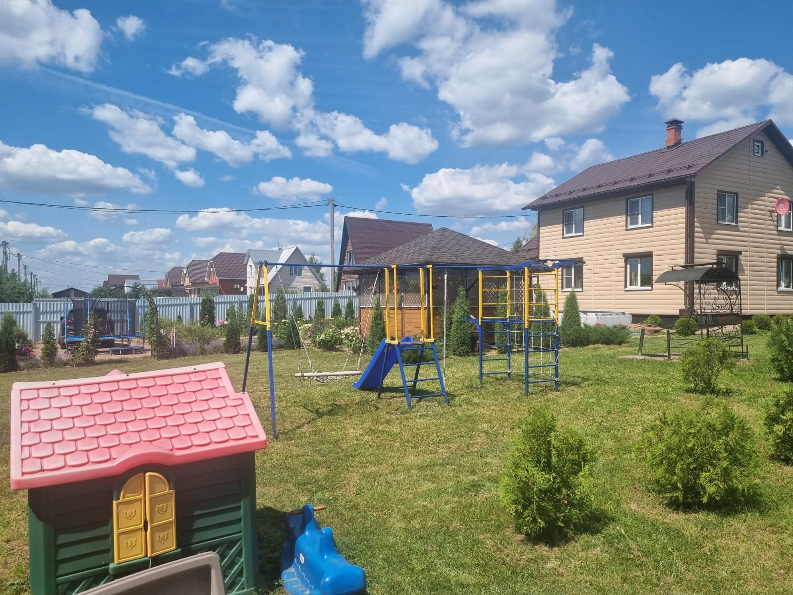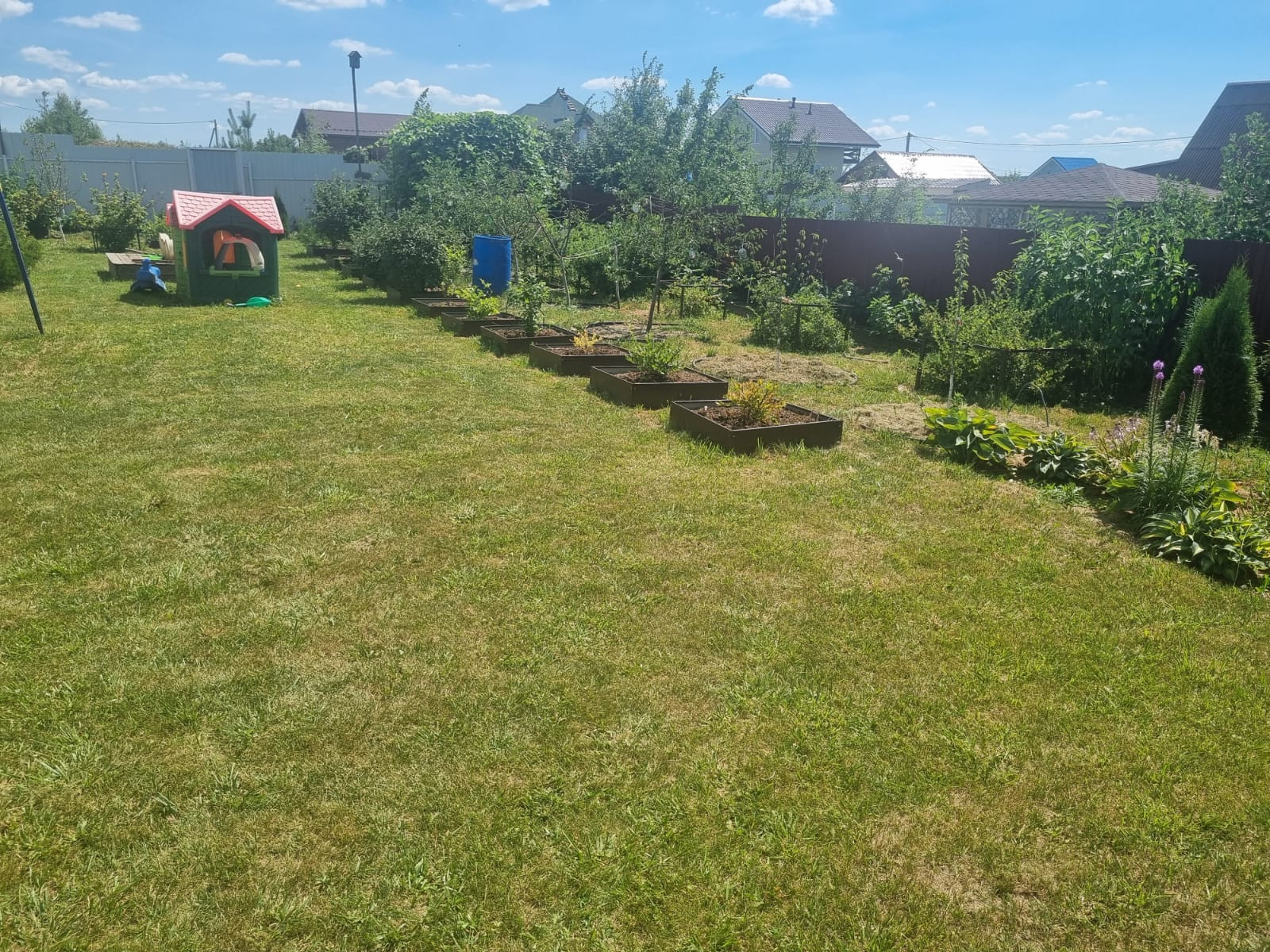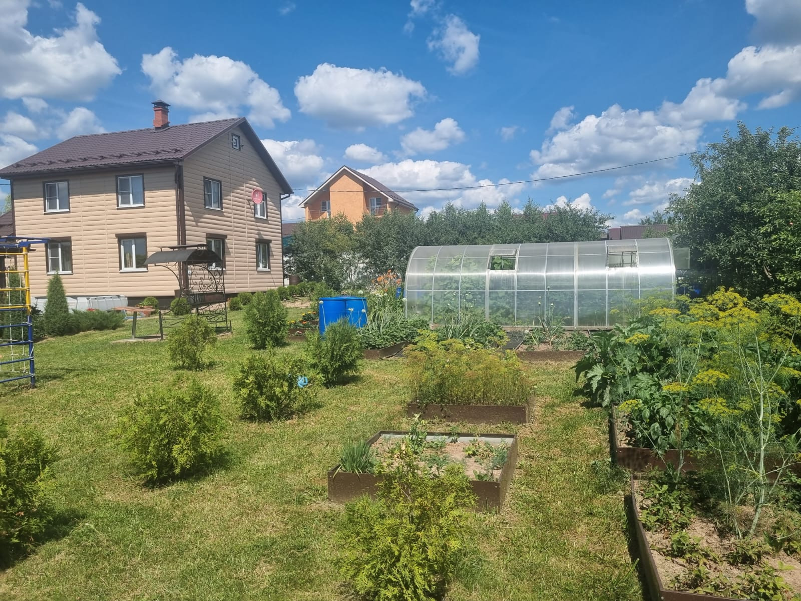 На участке расположены: детская игровая зона, мангальная зона, зона для каркасного бассейна, зона с качелями под навесом из винограда (сорт «Изабелла), беседка с мягкими окнами (4,25 м на 4,25 м), 2 бытовки ( 6 на 2.3 метра и 2 на 2 метра), колодец, скважина, септик-кольца, переливной; теплица с автоматическими форточками и капельным поливом (6 на 3 метра), оцинкованные грядки коричневого цвета в количестве 8 штук, по периметру: 5 яблонь, 3 груши, 3 черешни, 3 вишни, 9 слив, кустарники крыжовника, смородины, малины и ежевики, а также большое количество туй и можжевельников, цветов.