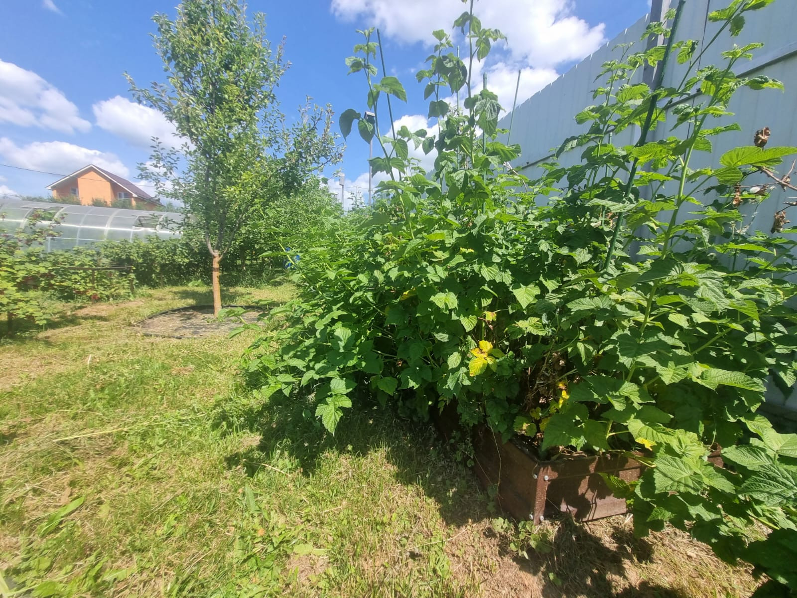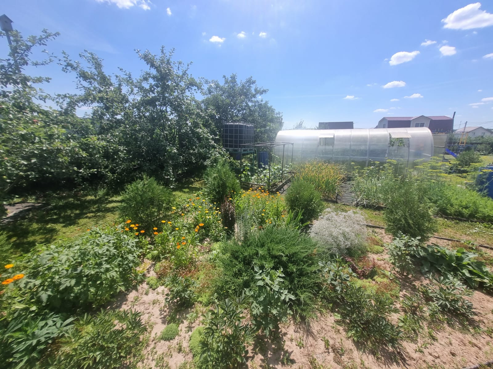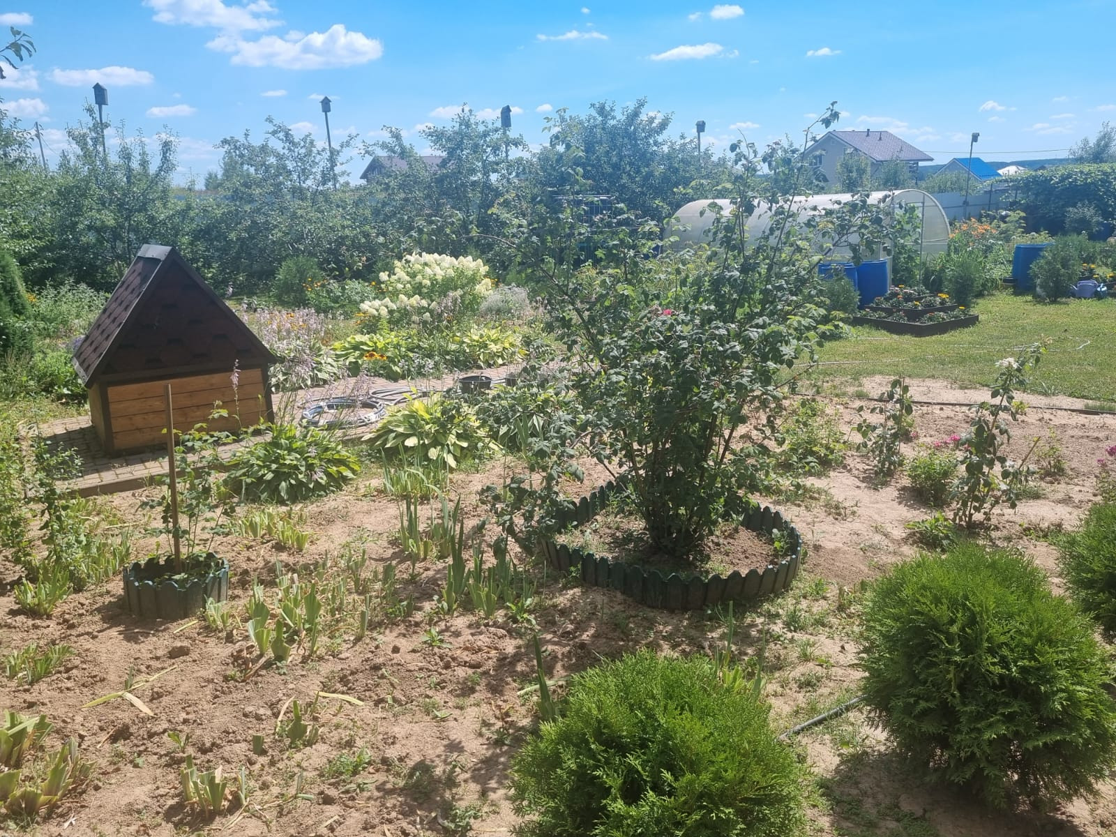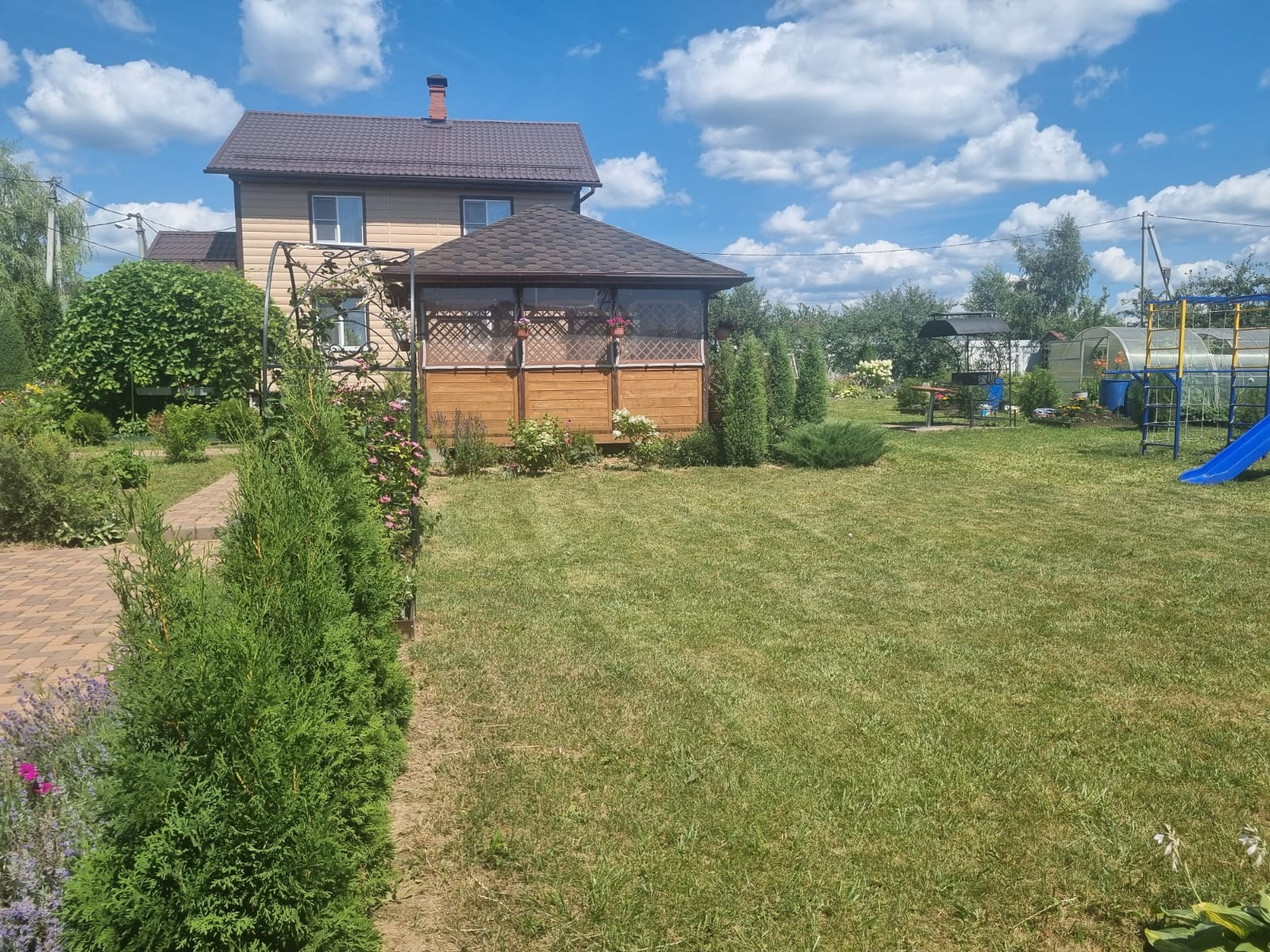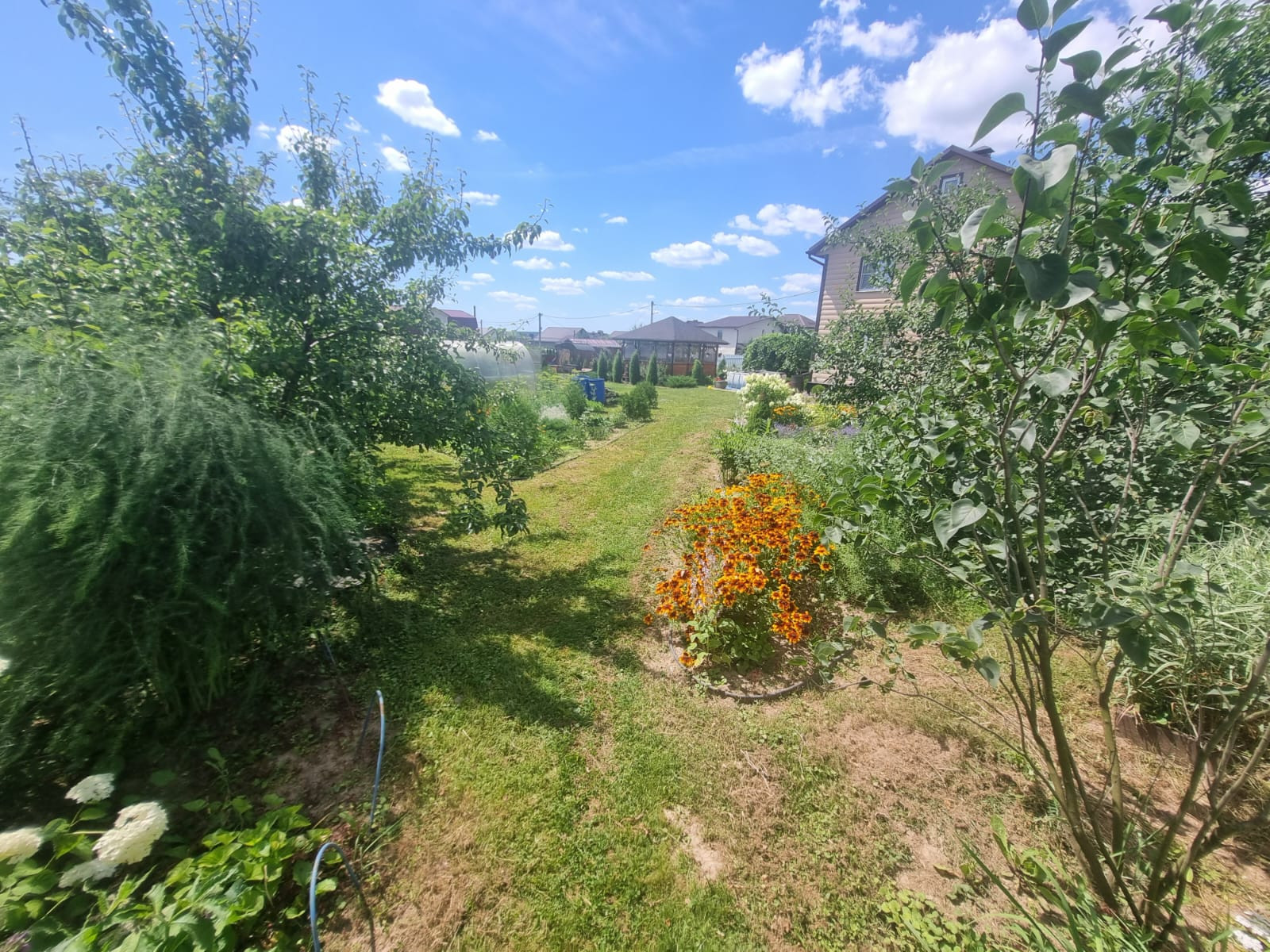 На участке расположены: детская игровая зона, мангальная зона, зона для каркасного бассейна, зона с качелями под навесом из винограда (сорт «Изабелла), беседка с мягкими окнами (4,25 м на 4,25 м), 2 бытовки ( 6 на 2.3 метра и 2 на 2 метра), колодец, скважина, септик-кольца, переливной; теплица с автоматическими форточками и капельным поливом (6 на 3 метра), оцинкованные грядки коричневого цвета в количестве 8 штук, по периметру: 5 яблонь, 3 груши, 3 черешни, 3 вишни, 9 слив, кустарники крыжовника, смородины, малины и ежевики, а также большое количество туй и можжевельников, цветов.