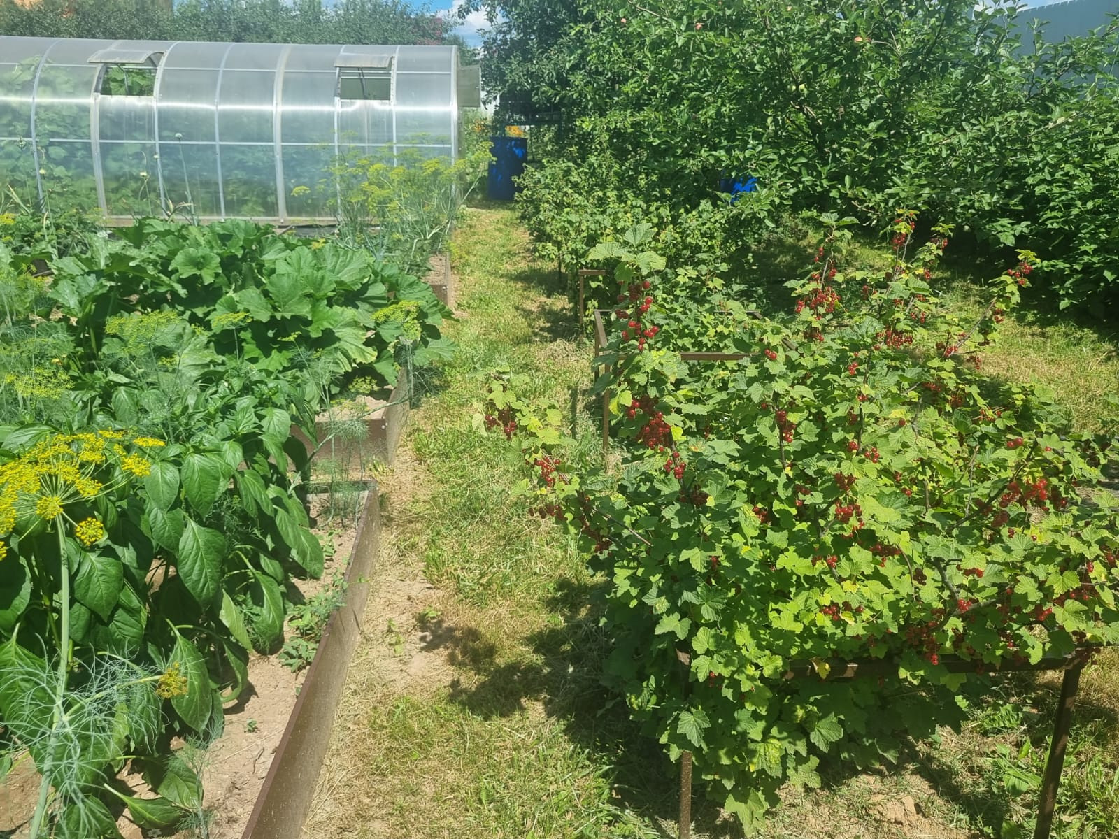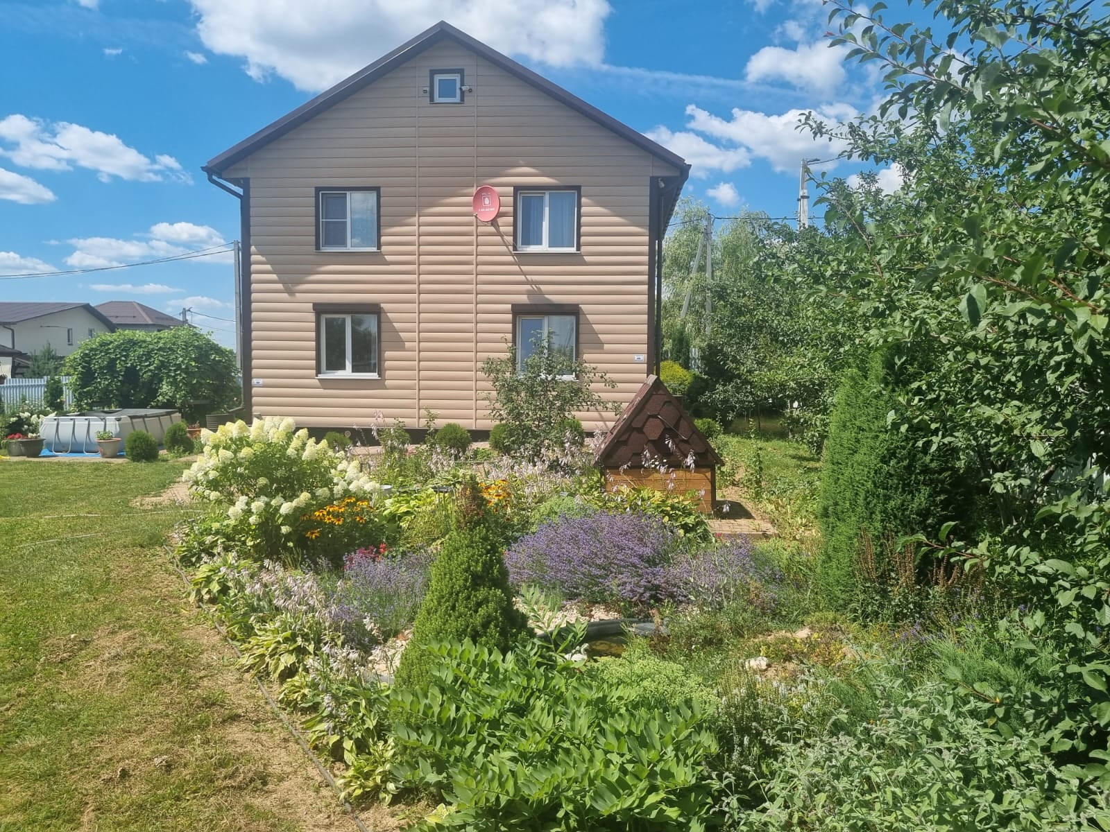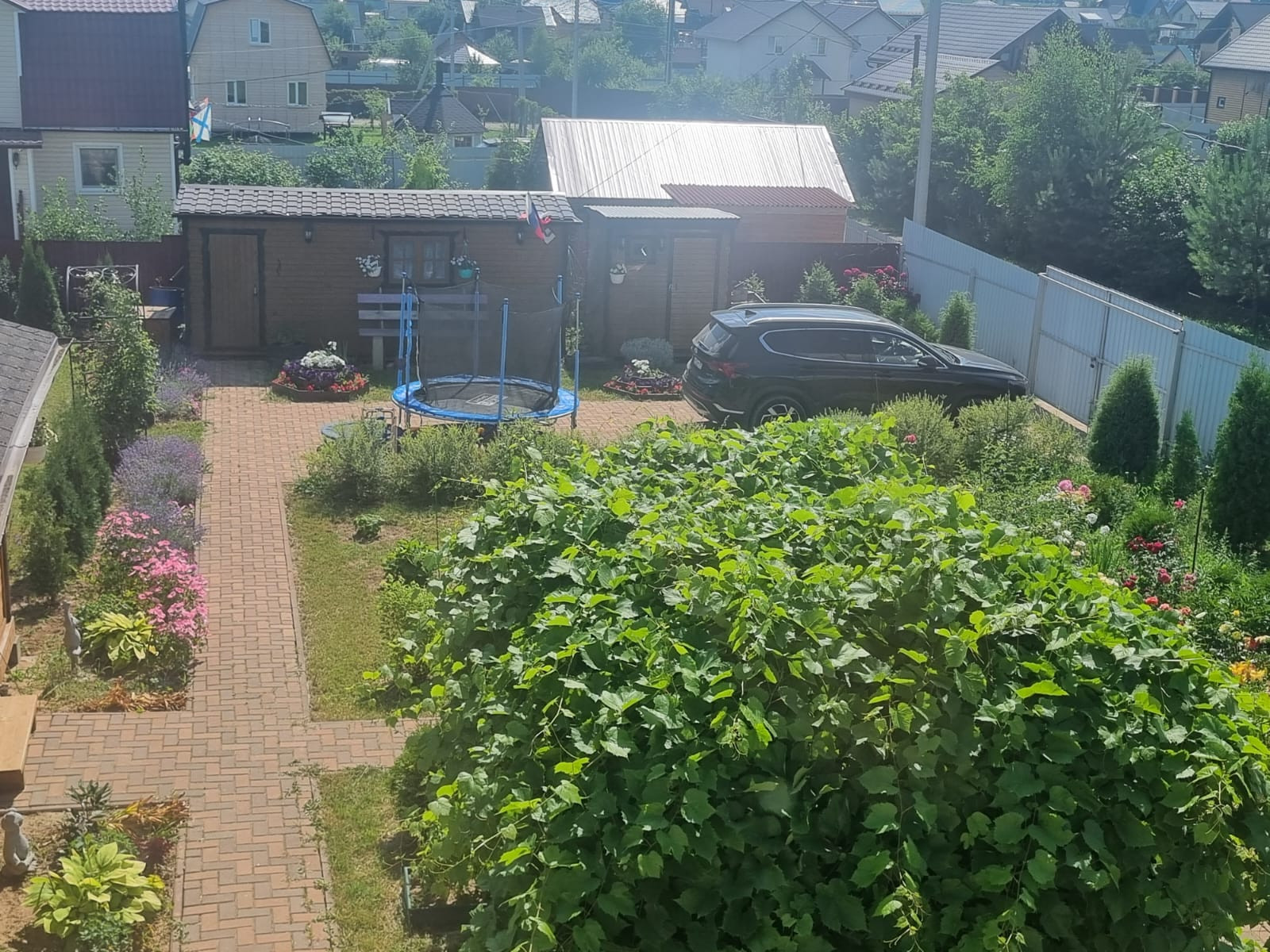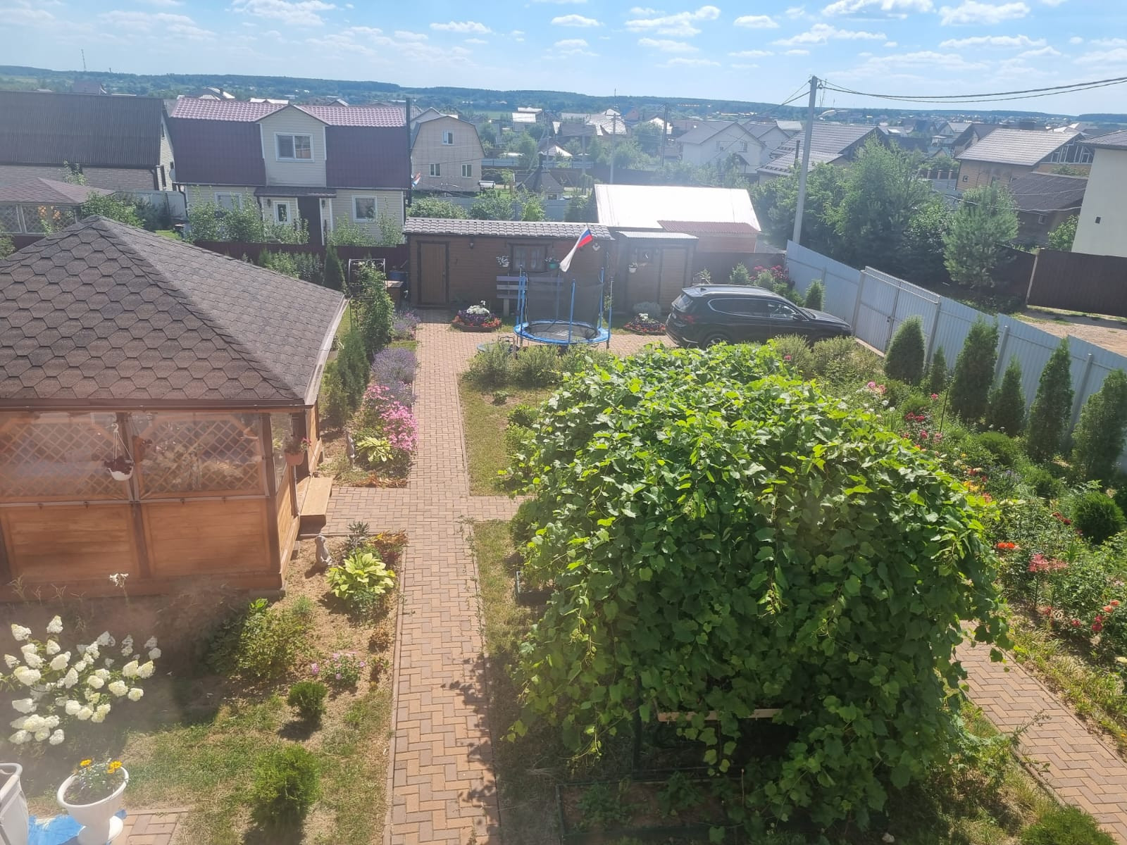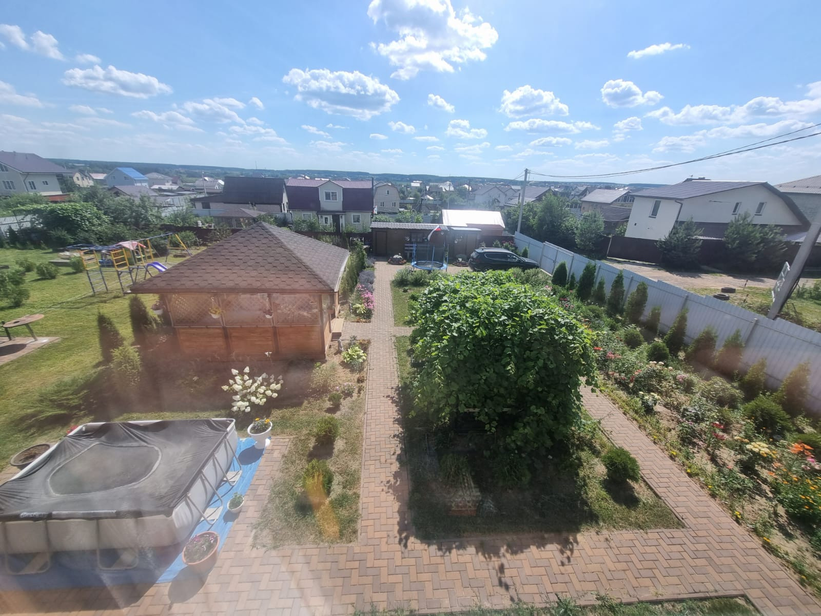 На участке расположены: детская игровая зона, мангальная зона, зона для каркасного бассейна, зона с качелями под навесом из винограда (сорт «Изабелла), беседка с мягкими окнами (4,25 м на 4,25 м), 2 бытовки ( 6 на 2.3 метра и 2 на 2 метра), колодец, скважина, септик-кольца, переливной; теплица с автоматическими форточками и капельным поливом (6 на 3 метра), оцинкованные грядки коричневого цвета в количестве 8 штук, по периметру: 5 яблонь, 3 груши, 3 черешни, 3 вишни, 9 слив, кустарники крыжовника, смородины, малины и ежевики, а также большое количество туй и можжевельников, цветов.
