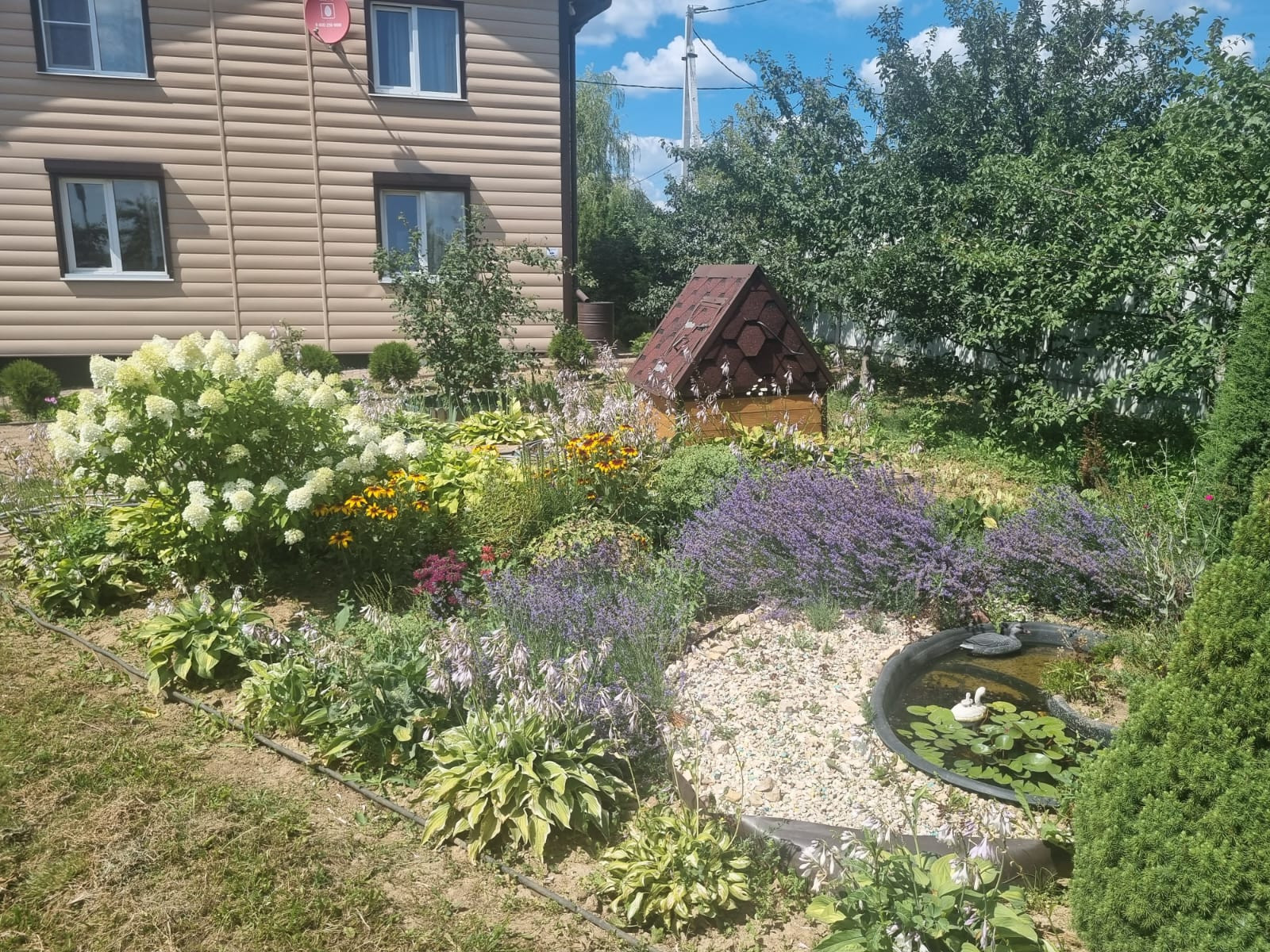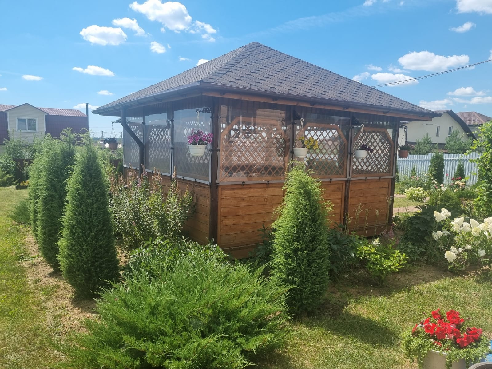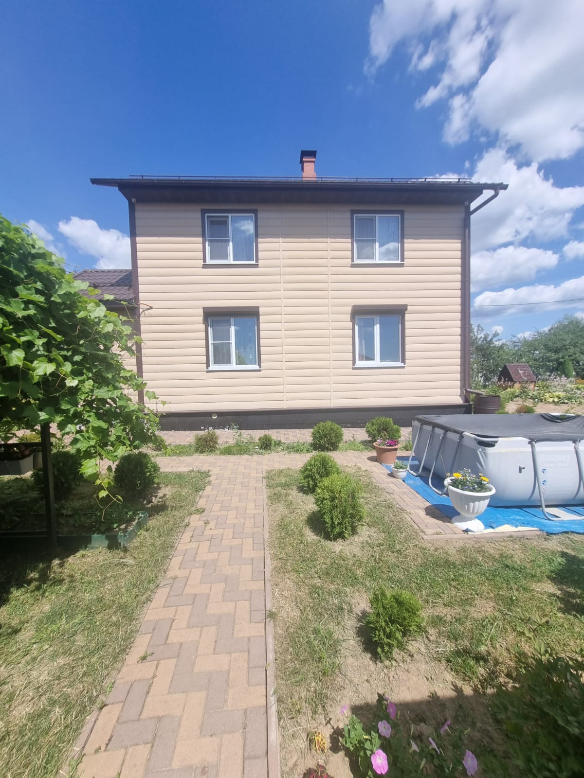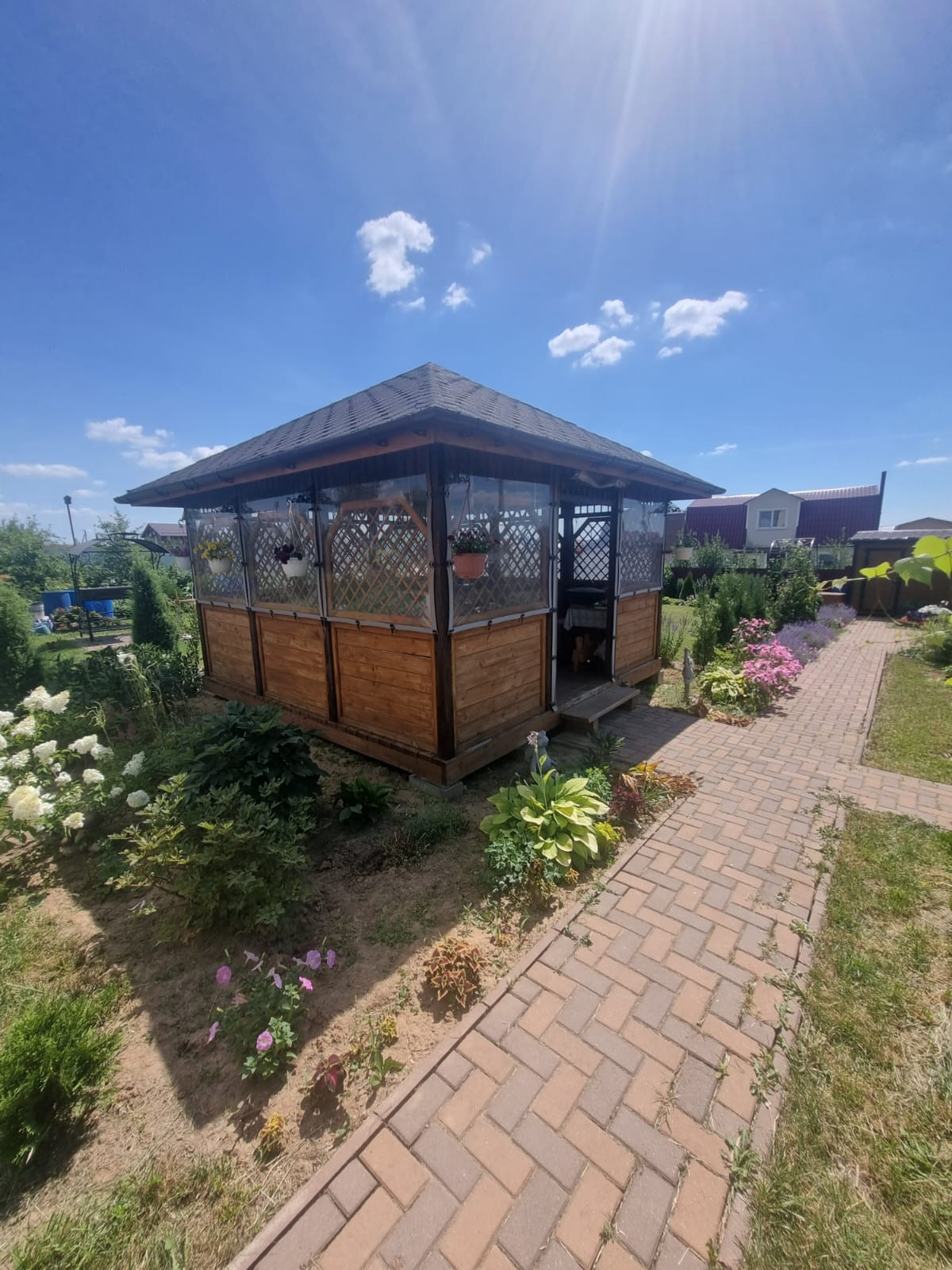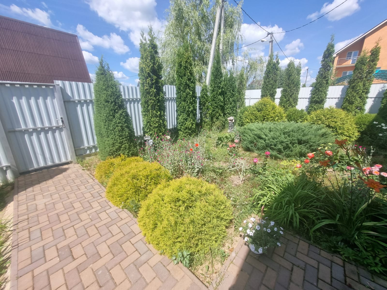 На участке расположены: детская игровая зона, мангальная зона, зона для каркасного бассейна, зона с качелями под навесом из винограда (сорт «Изабелла), беседка с мягкими окнами (4,25 м на 4,25 м), 2 бытовки ( 6 на 2.3 метра и 2 на 2 метра), колодец, скважина, септик-кольца, переливной; теплица с автоматическими форточками и капельным поливом (6 на 3 метра), оцинкованные грядки коричневого цвета в количестве 8 штук, по периметру: 5 яблонь, 3 груши, 3 черешни, 3 вишни, 9 слив, кустарники крыжовника, смородины, малины и ежевики, а также большое количество туй и можжевельников, цветов.