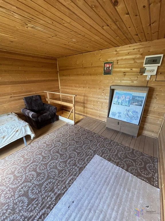 На первом этаже расположены кухня и комната, а на втором этаже — одна комната. Снаружи дом отделан сайдингом, а внутри — вагонкой.