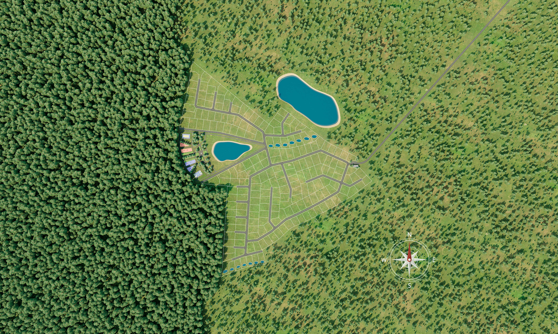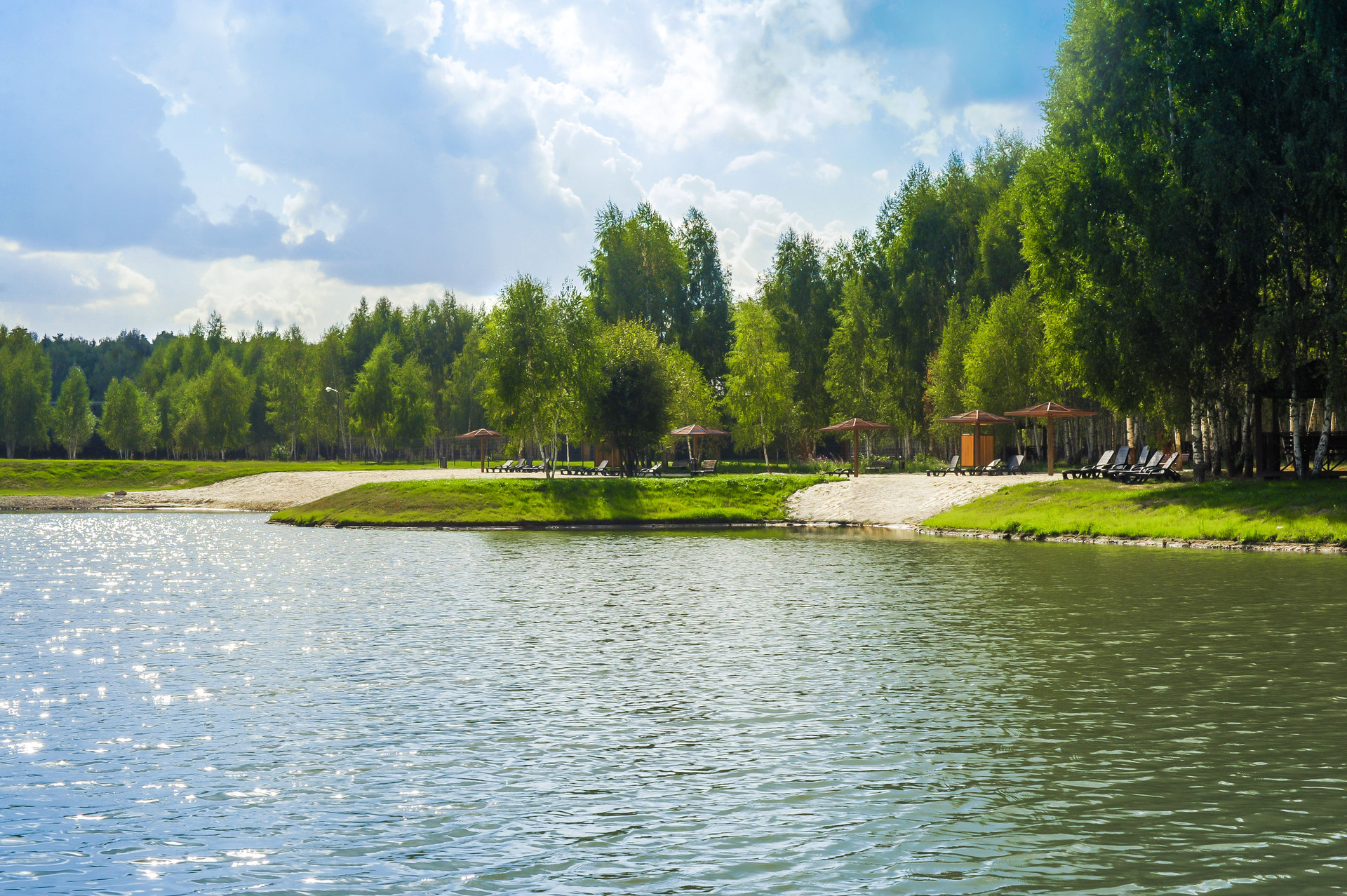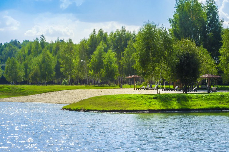 На территории посёлка: два озера для рыбалки и собственный пляж, спортивные площадки, детский городок.