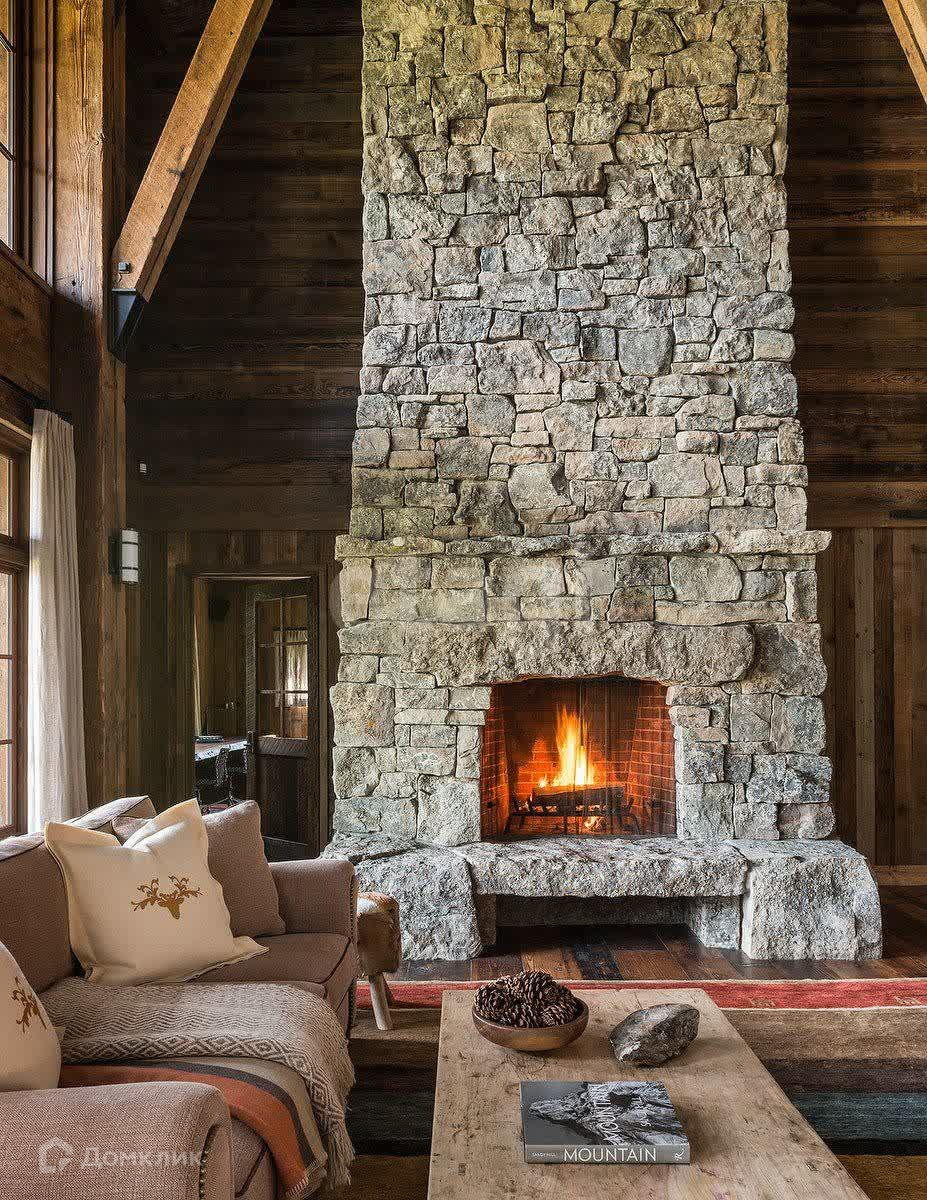 Гостиная площадью 70 кв.м и высотой потолка в уровень трех этажей;