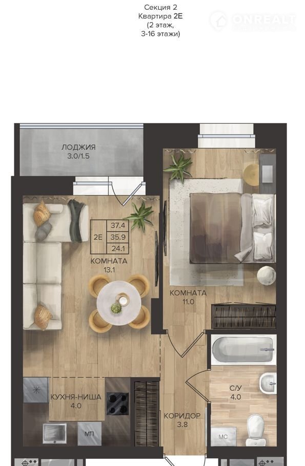 Общая площадь 37.4 м2