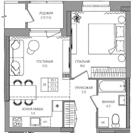 Общая площадь 39.1 м2