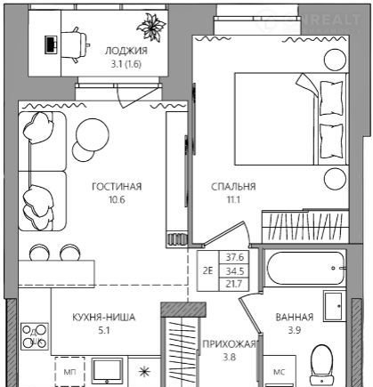 Общая площадь 36.1 м2