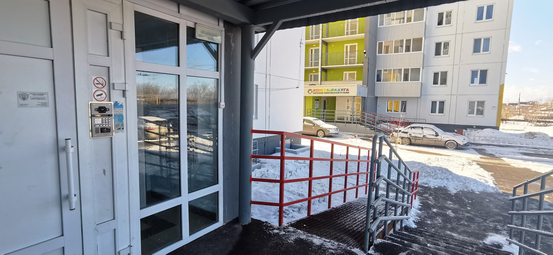 Чистый и опрятный подъезд, 2 лифта. Тамбур на 2 квартиры – дополнительное место для хранения коляски, санок и обуви.