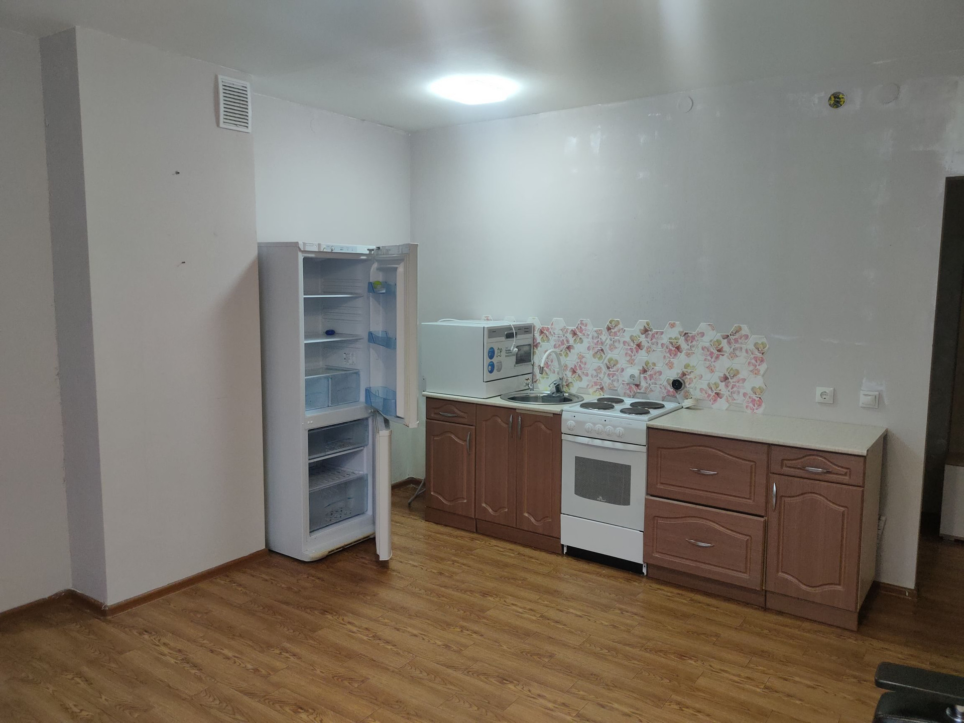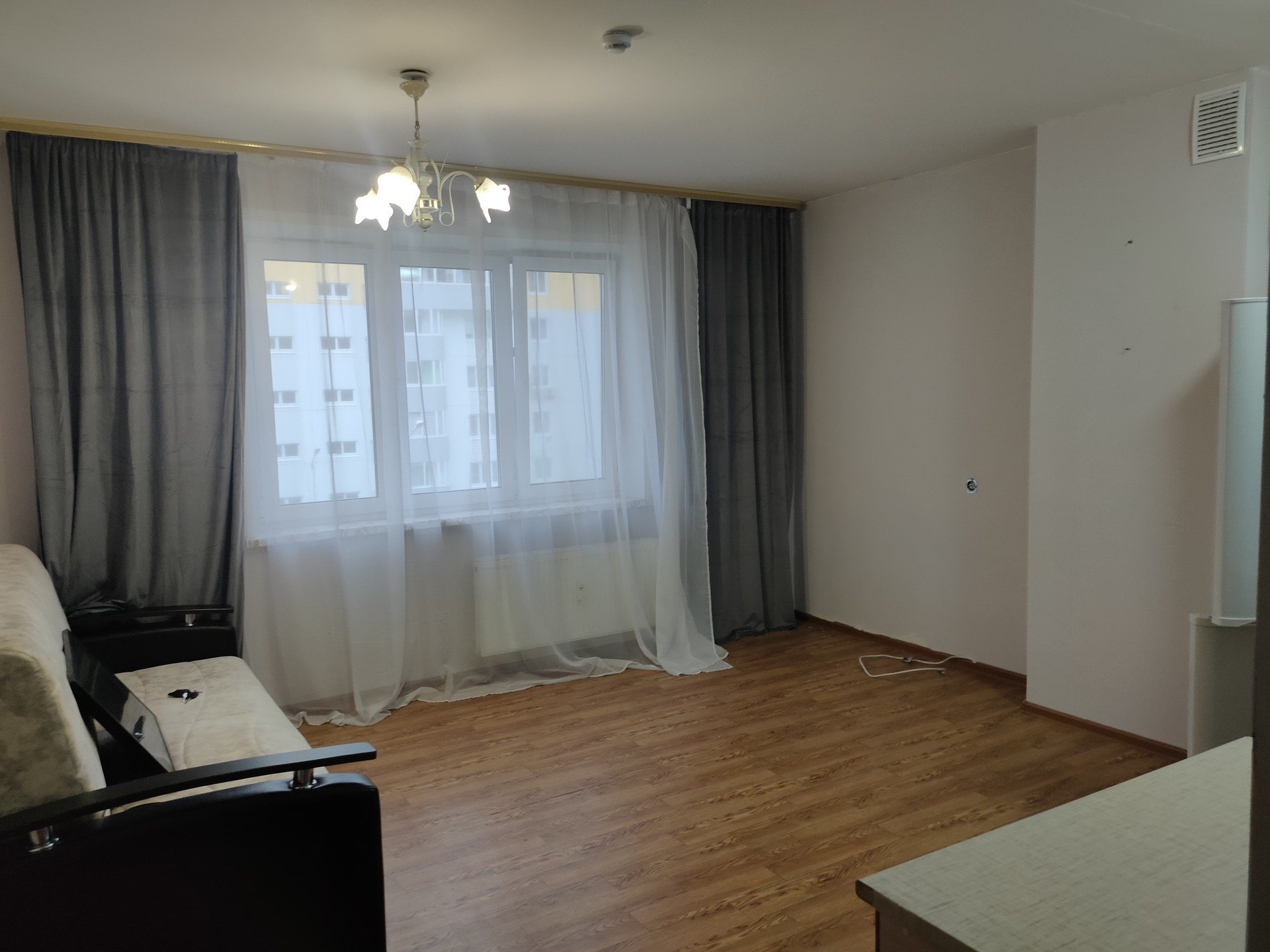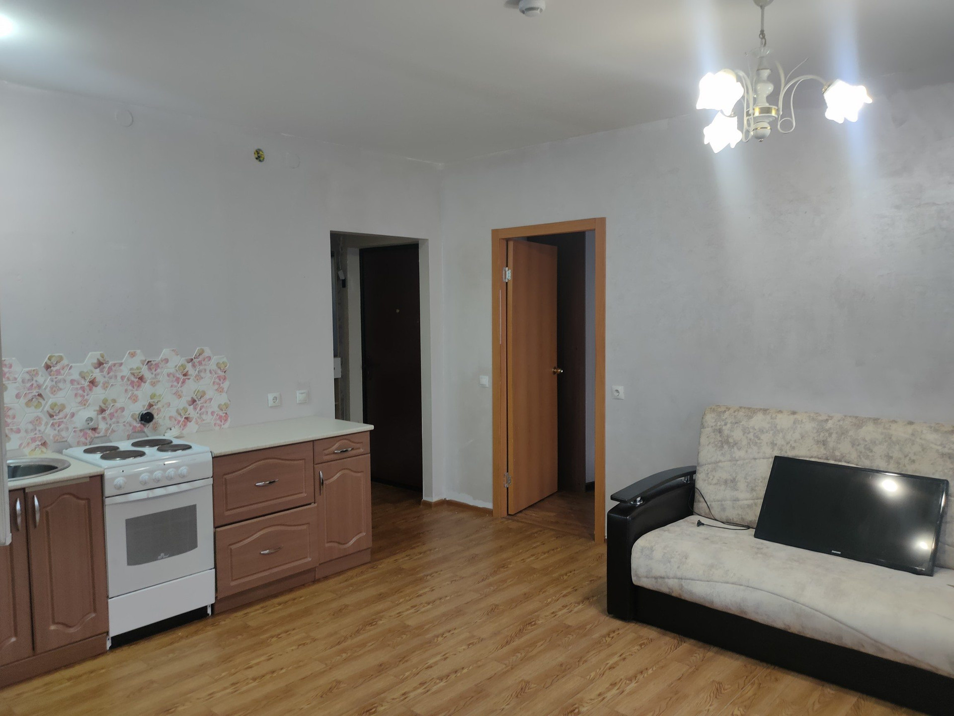 Отличная планировка с большой кухней - гостиной (кухонный гарнитур остаётся в подарок). Просторная комната с выходом на балкон.