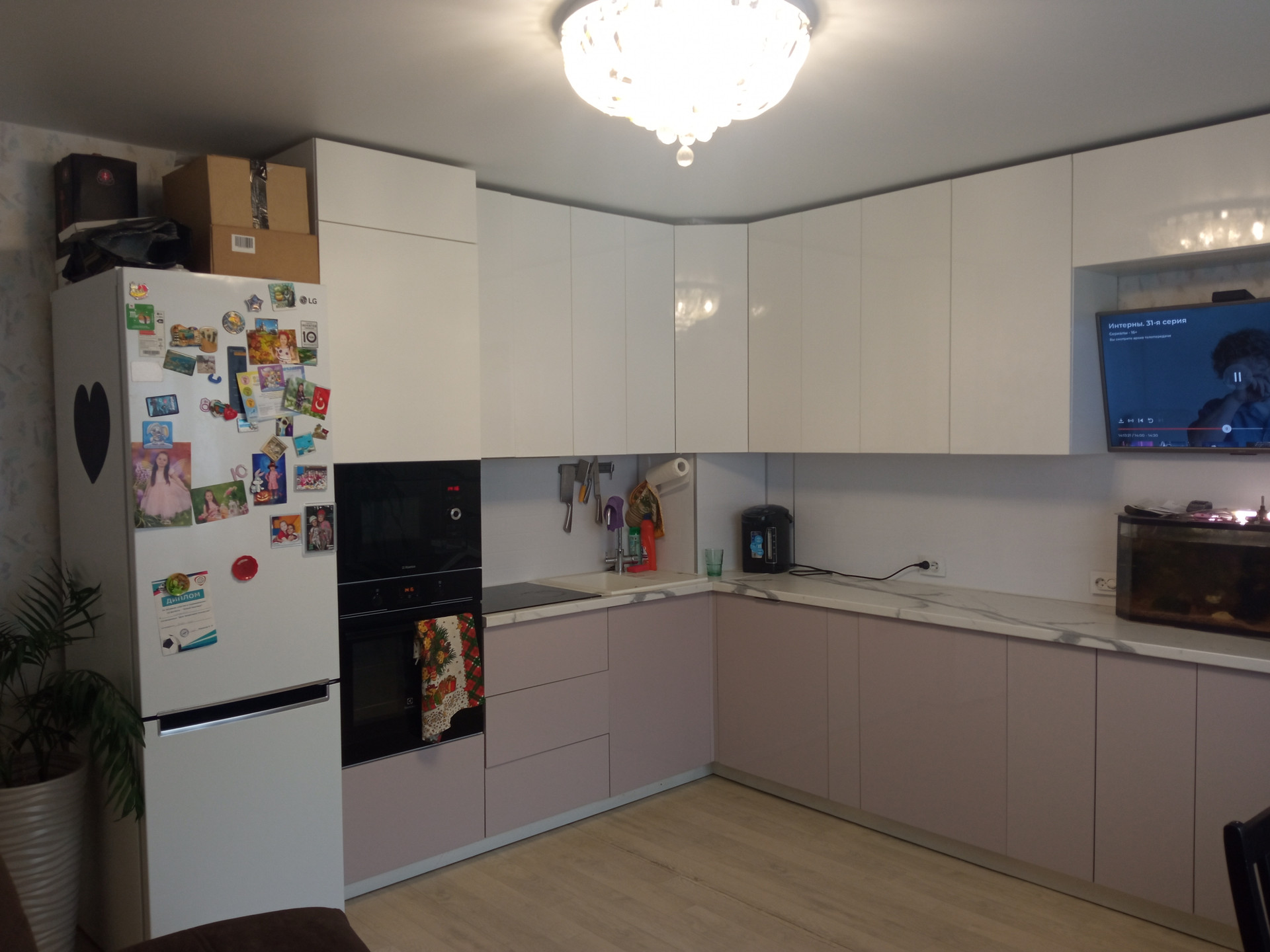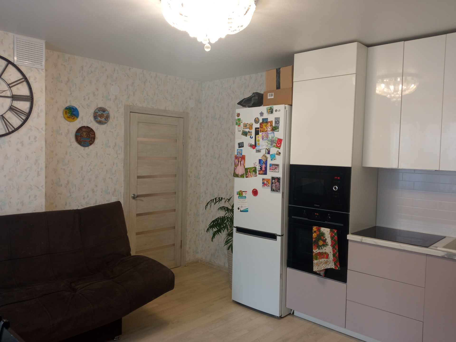Кухня с встроенной посудомоечной и стиральной машинами, духовым шкафом и микроволновкой. Все остается новым жильцам.