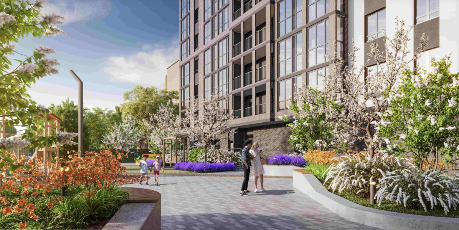 3) Двор для взрослых. Пока ваши дети играют, вы сможете прогуляться по «тропе здоровья», позаниматься на тренажёрах или заняться йогой. Даже ночью! На территории дома предусмотрено вечернее приятное многоуровневое освещение. Все элементы двора созданы из натуральных материалов.