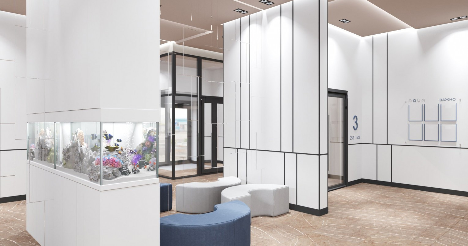 5) Дизайнерский холл и ресепшн. Aqua сразу ассоциируется с аквариумом. Атмосфера подводного мира создана и на первом этаже. Витражное остекление, сине-голубые оттенки и домашний уют. А главное настоящий аквариум с живыми рыбками, посмотрев на который, вы расслабитесь и получите эстетическое удовольствие.