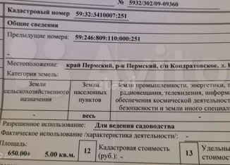 Продам земельный участок в садоводческом кооперативе "Эмсон" 9 соток.Земли поселения д. Кондратово. Участок обрабатывается. Находится рядом с жилым комплексом "Медовый". Кадастровый номер 59.32.3410017.0005 отвечаю только на звонки. |