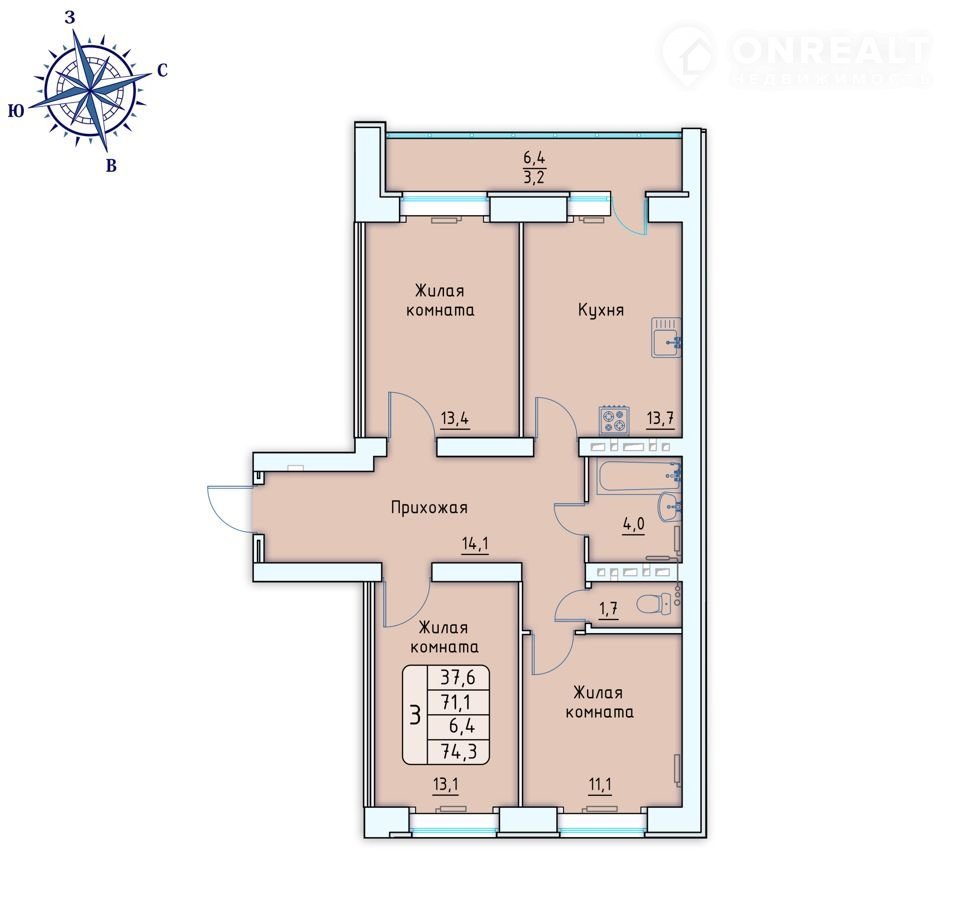 Общая площадь 74.3 м2