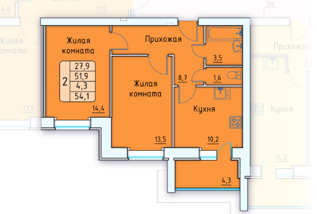 Общая площадь 54 м2