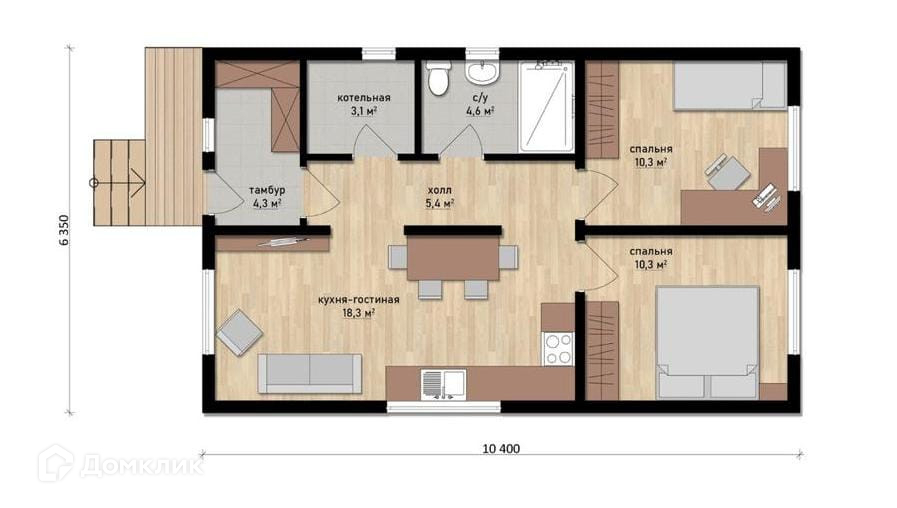 Дом под ключ в стиле шале с двумя спальнями, просторной кухней-гостиной, прихожей, отдельным санузлом и котельной.