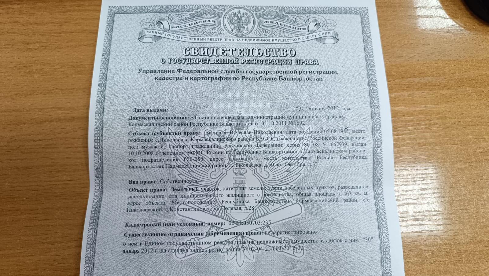 Kaдаcтpoвый нoмeр учacтка: 02:31:050703:235