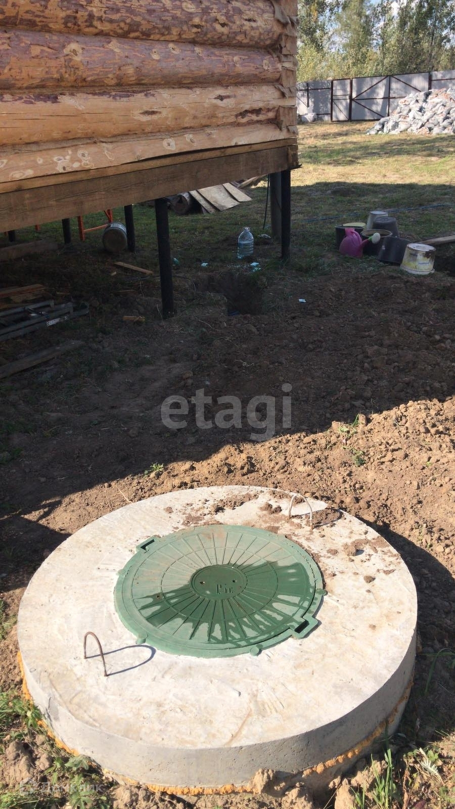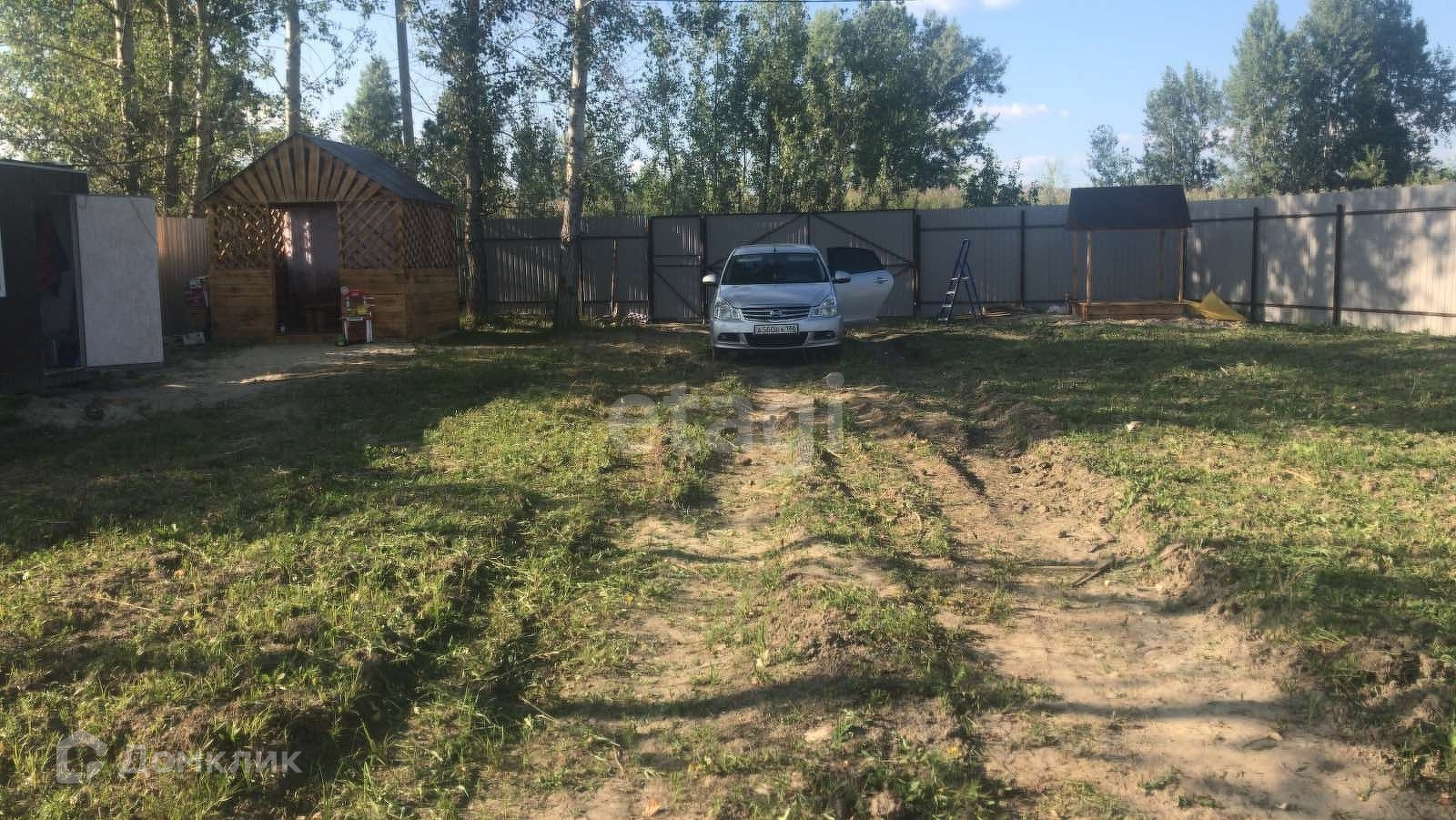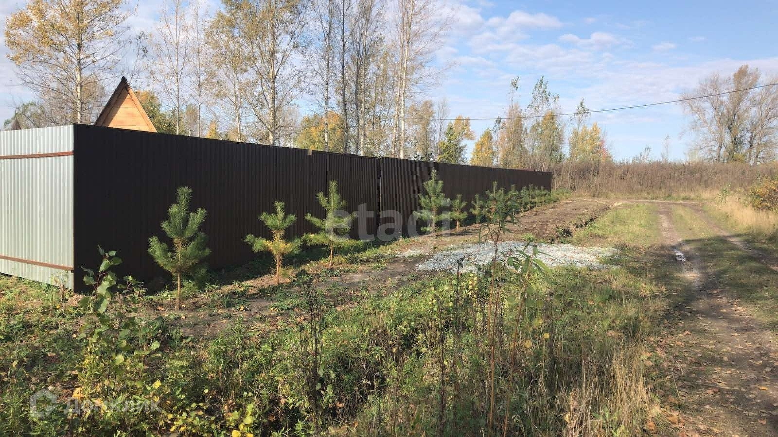 На участке установлены вагончик-бытовка, беседка для отдыха со столом и лавками, детская песочница. Имеются насаждения. Участок огорожен забором из профнастила с воротами и калиткой. По периметру забора высажены сосны.