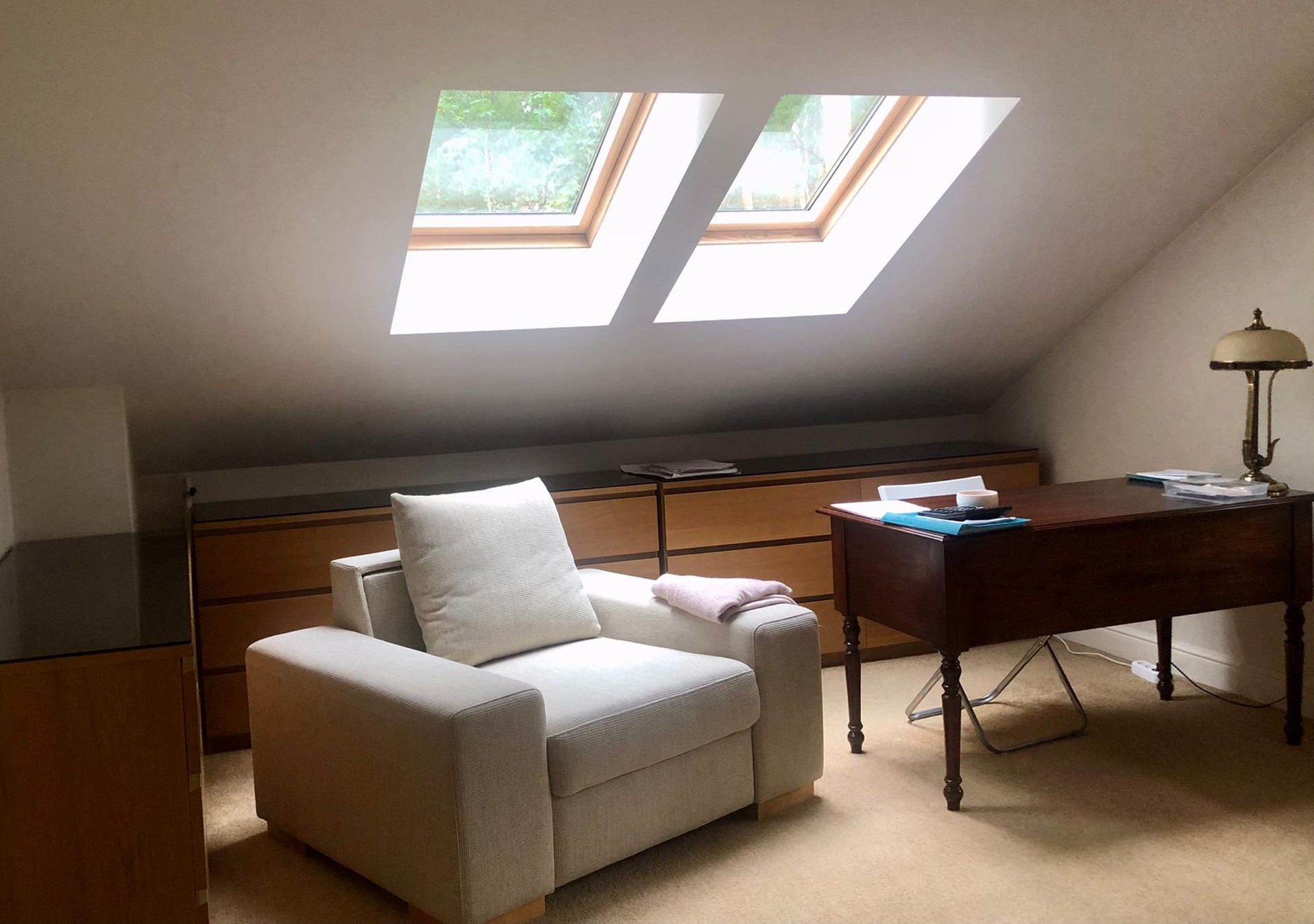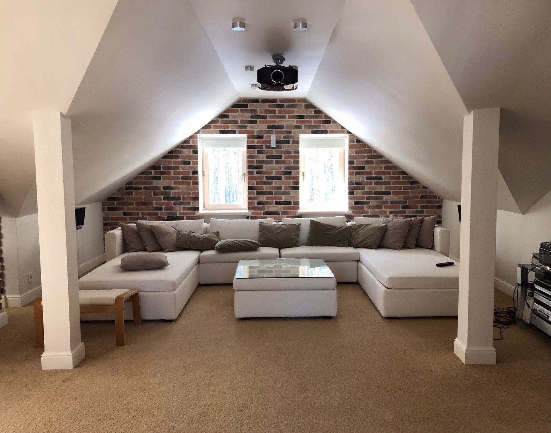 открытое помещение (домашний кинотеатр) 68м2, гостевая комната 16 м2, мансардные окна Velux.