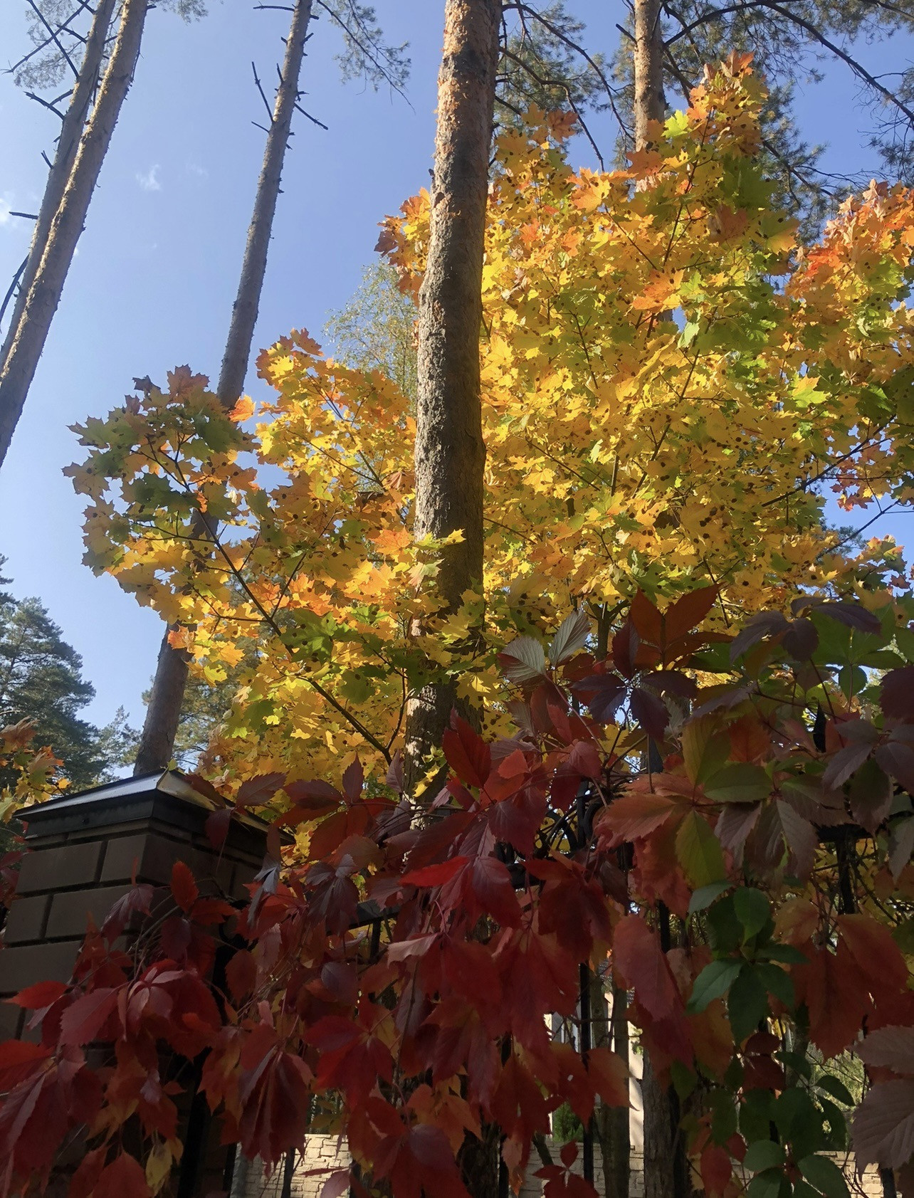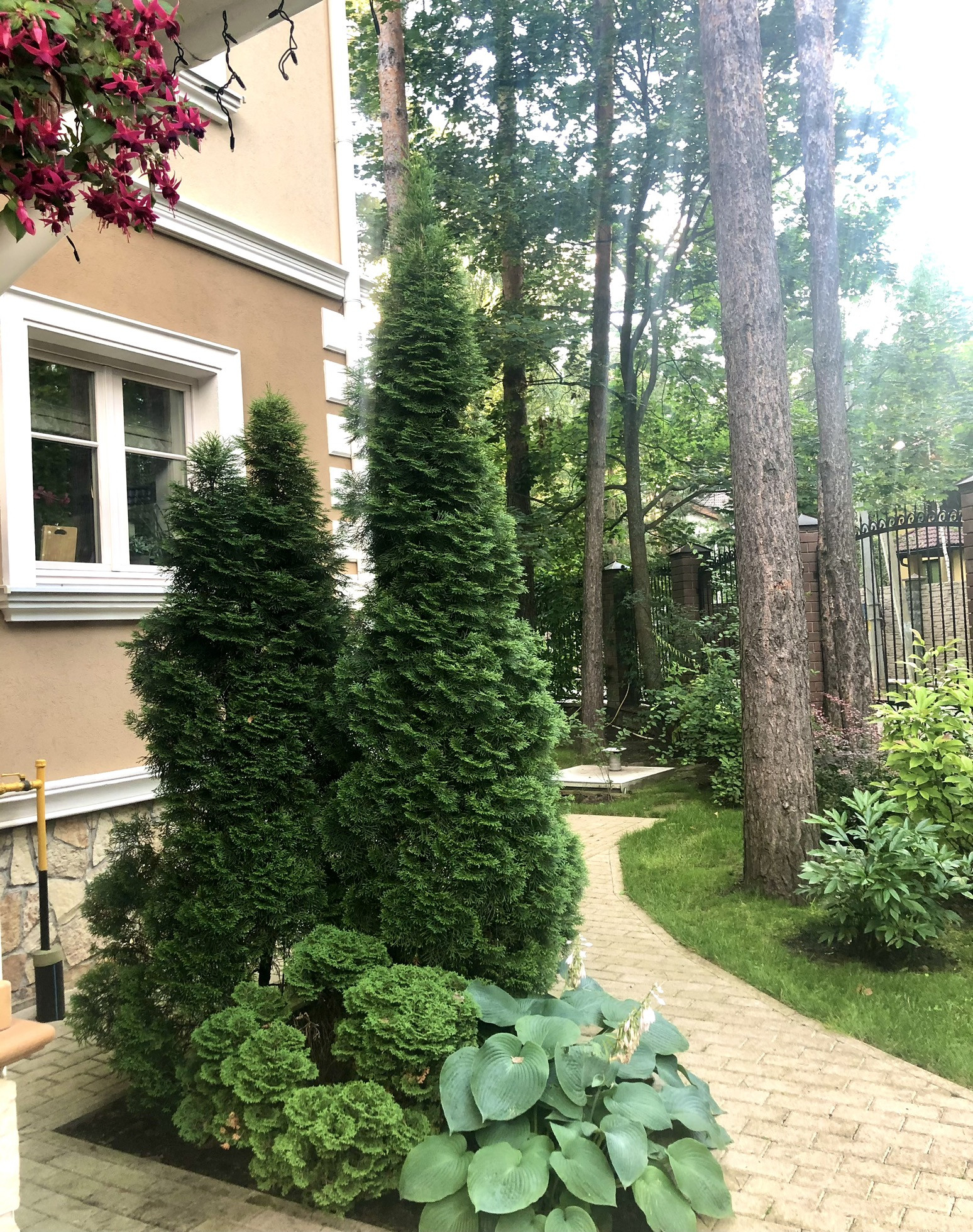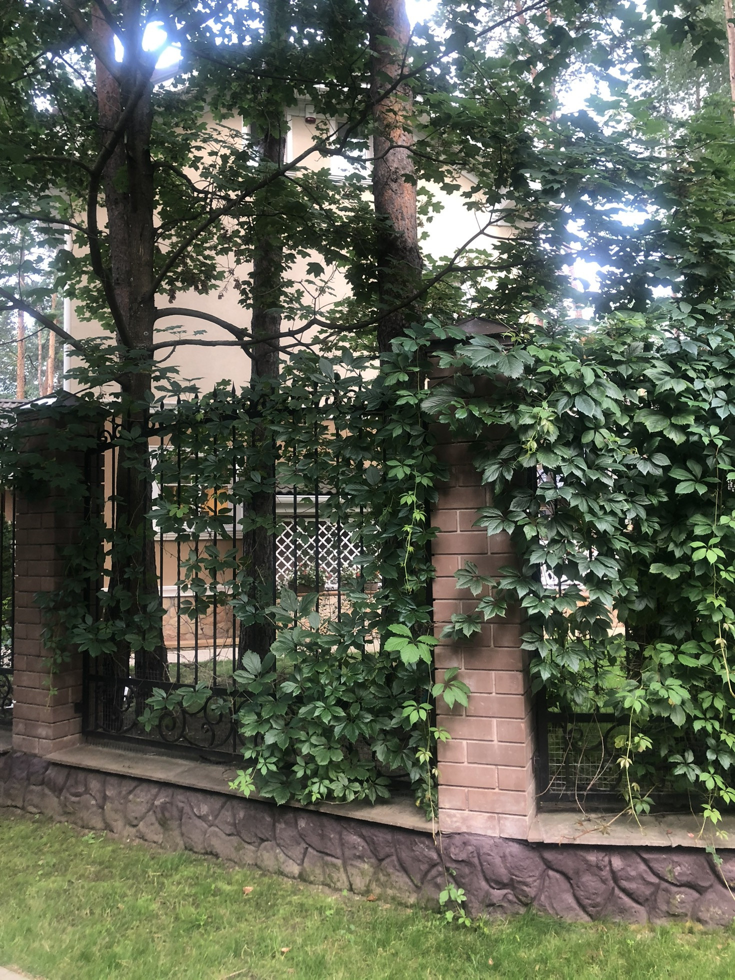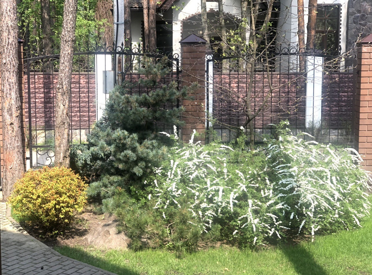 Участок лесной, сухой, грунты песчаные, полностью спланирован, ухожен, на участке сосны, березы, клены, газон, цветущие деревья и кустарники, хвойники, цветники, кованый забор по периметру.