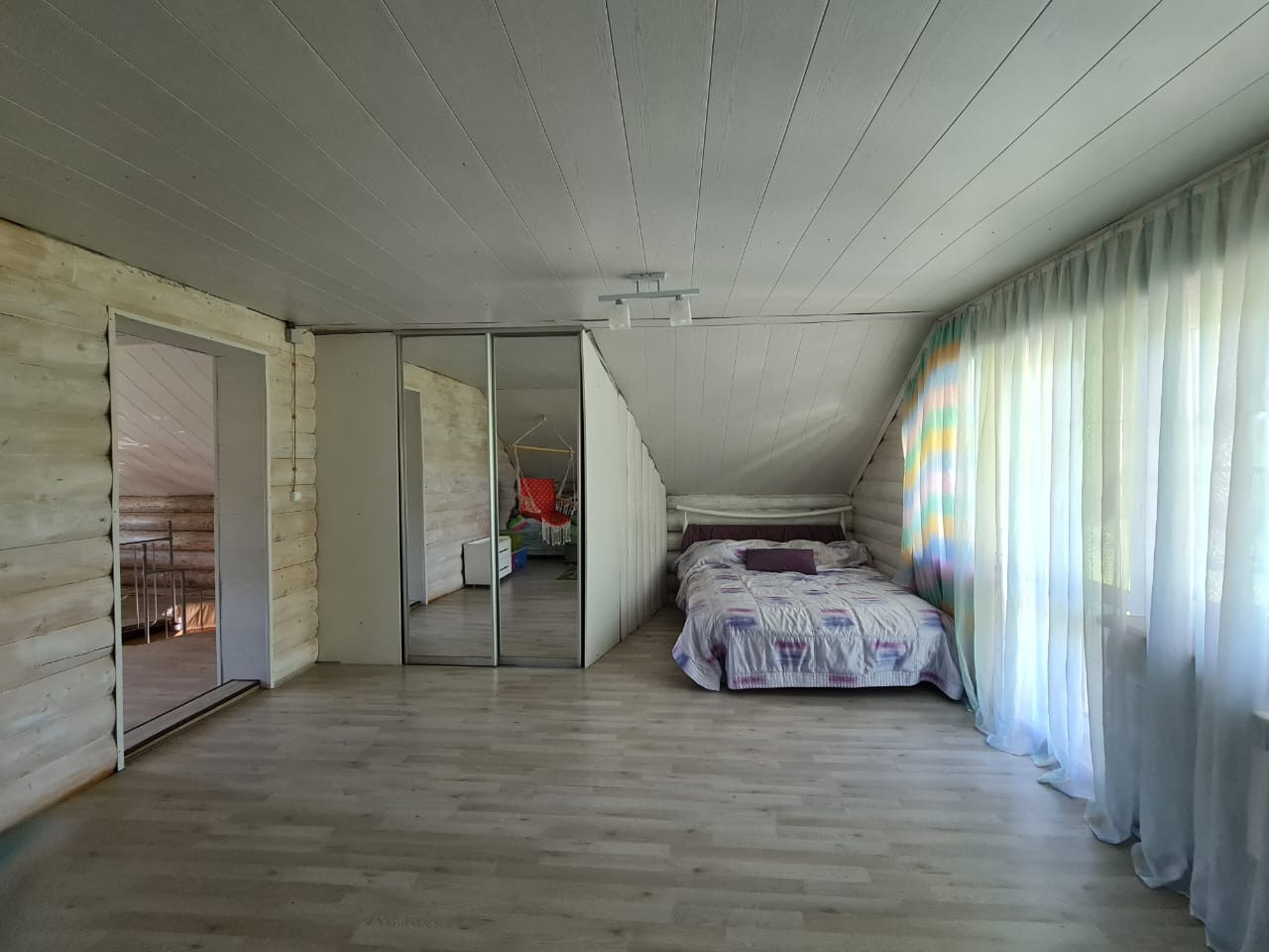 На втором этаже: гостиная 28м2, спальня 27м2, большой застекленный балкон.