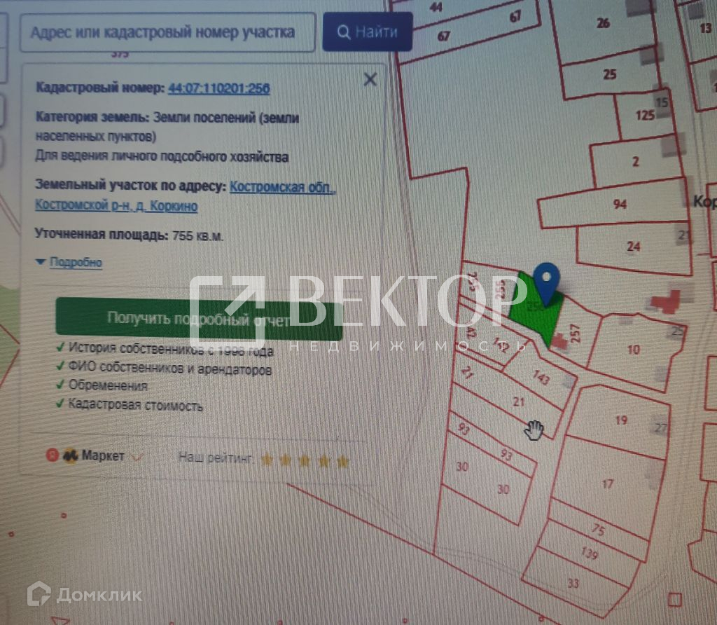 Продается земельный участок 7, 5 соток в д. Коркино, 8 км от Костромы по Волгореченскому тракту, рядом с д. Середняя.              Вид разрешенного использования: для ведения личного подсобного хозяйства, земли населенного пункта, подходит для строительства индивидуального жилого дома. Межевание земельного участка выполнено, кадастровый номер 44: 07: 110201: 256.Очень живописное место, рядом   лес, р. Волга и Кубань, ключ. Коммуникации (природный газ, электричество) на краю границы участка.В 500 м находится школа, садик, 4 магазина, почта, остановка.Помощь в одобрении и оформлении ипотеки от банков партнеров - Сбербанк, Банк ВТБ, Газпромбанк и др. Работа с государственными сертификатами и программами. Юридическая чистота сделки: полная проверка документов по объекту недвижимости, полное сопровождение на всех этапах сбора документов, помощь в их оформлении. Сопровождение сделки до перехода права собственности. Безопасные расчеты сторон. Все консультации бесплатно!!!