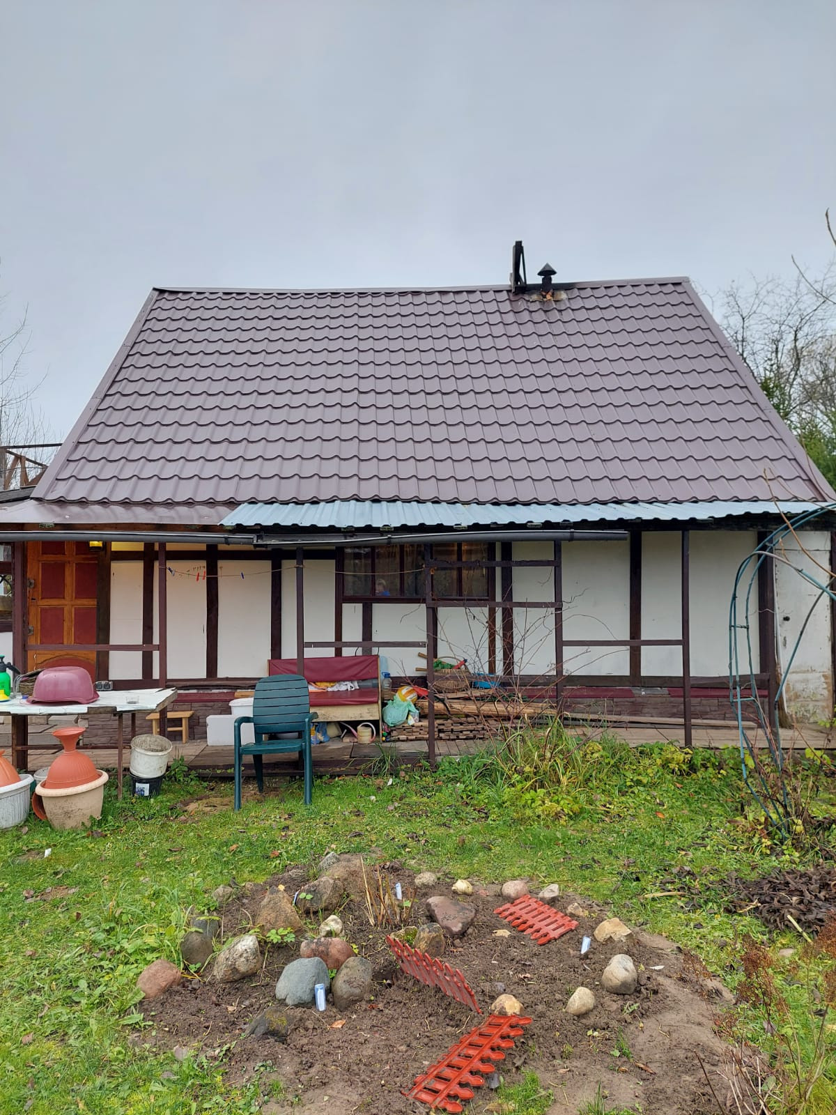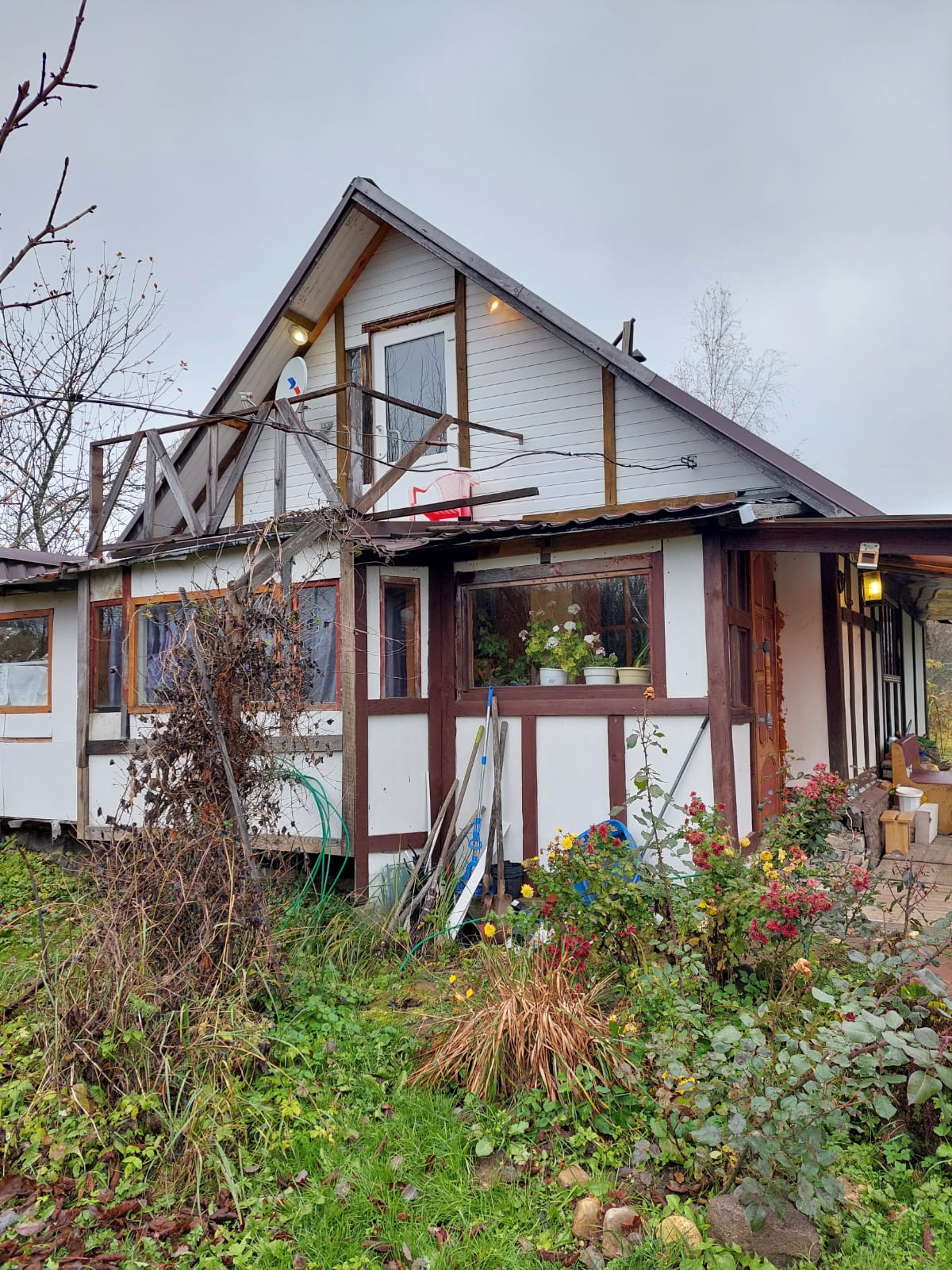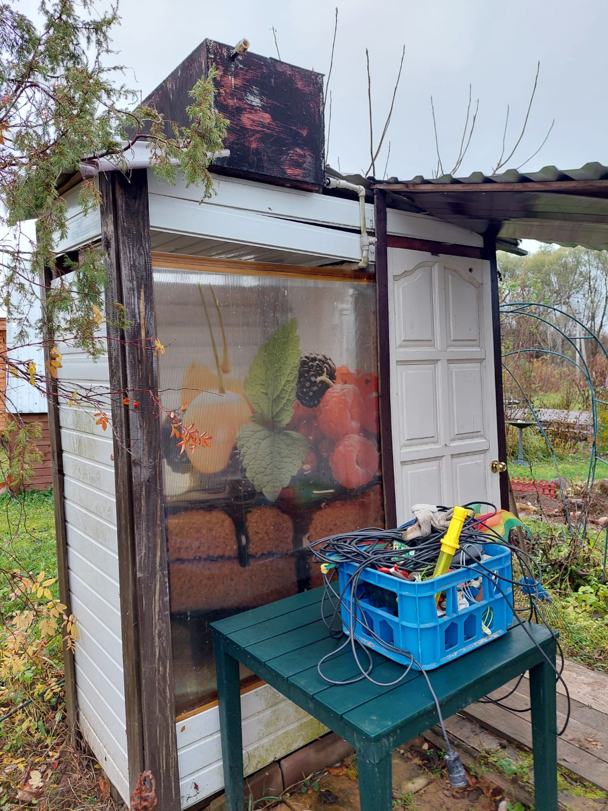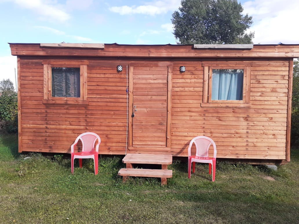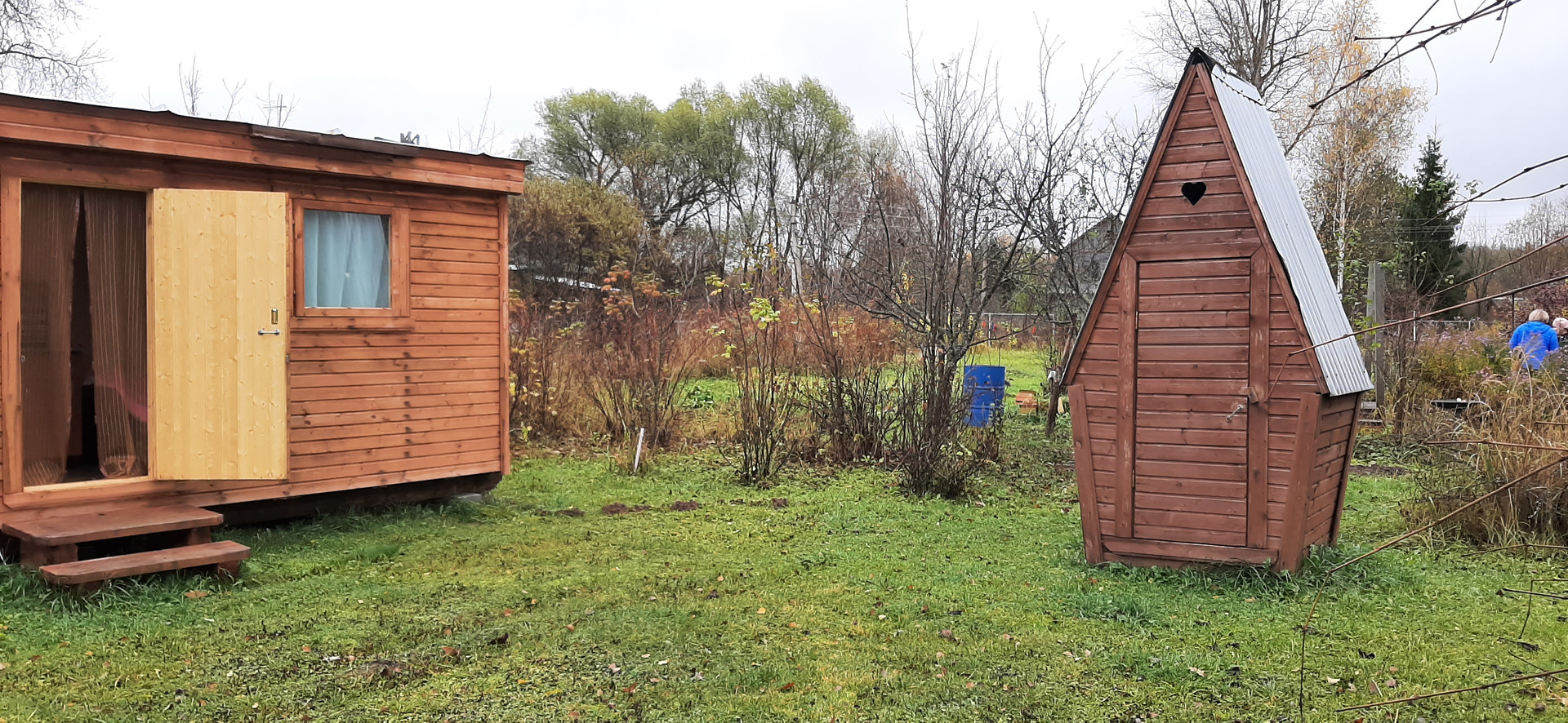 На участке также расположен вагончик для проживания в летнее время, есть летний душ, туалет, хоз. постройки, дровяник, а также обеденная зона в саду.