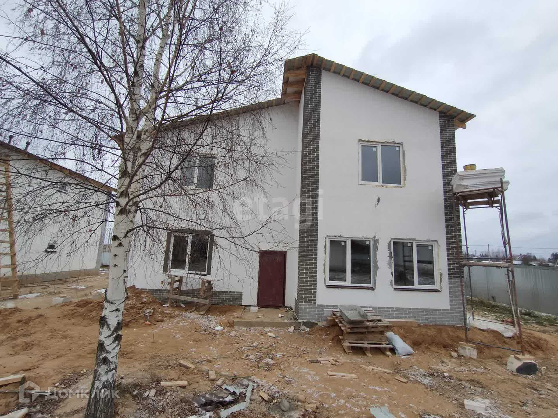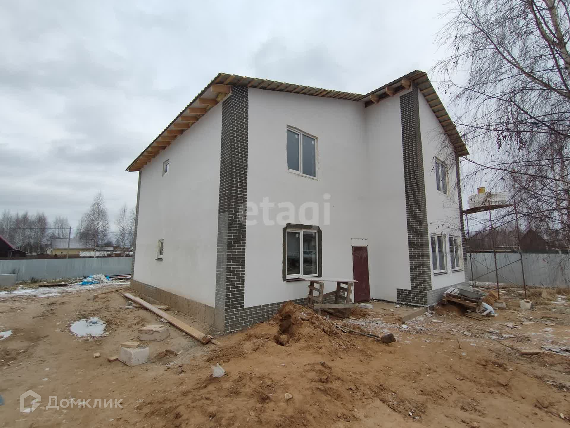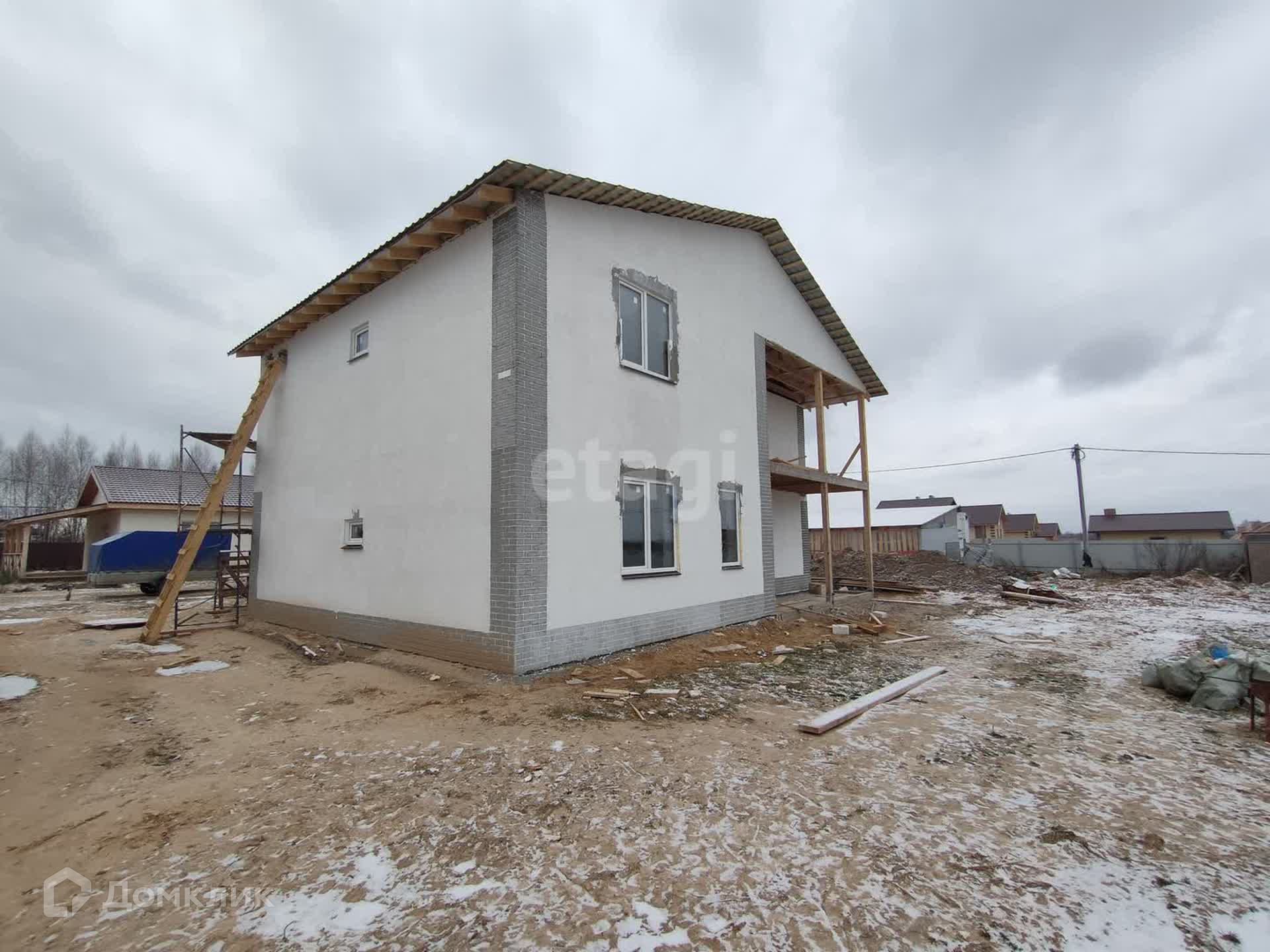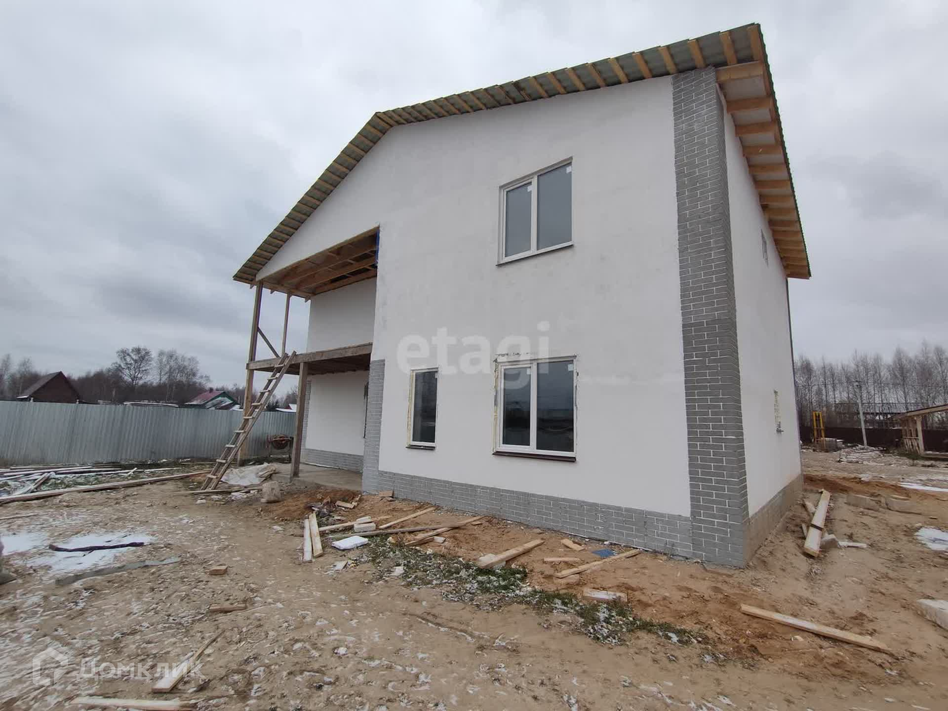 Двухэтажный 210 квадратных метров на земельном участке 12 соток. Стены - газоблок, фасад - штукатурка, крыша - металочерепица. Коттедж в черновой отделке.