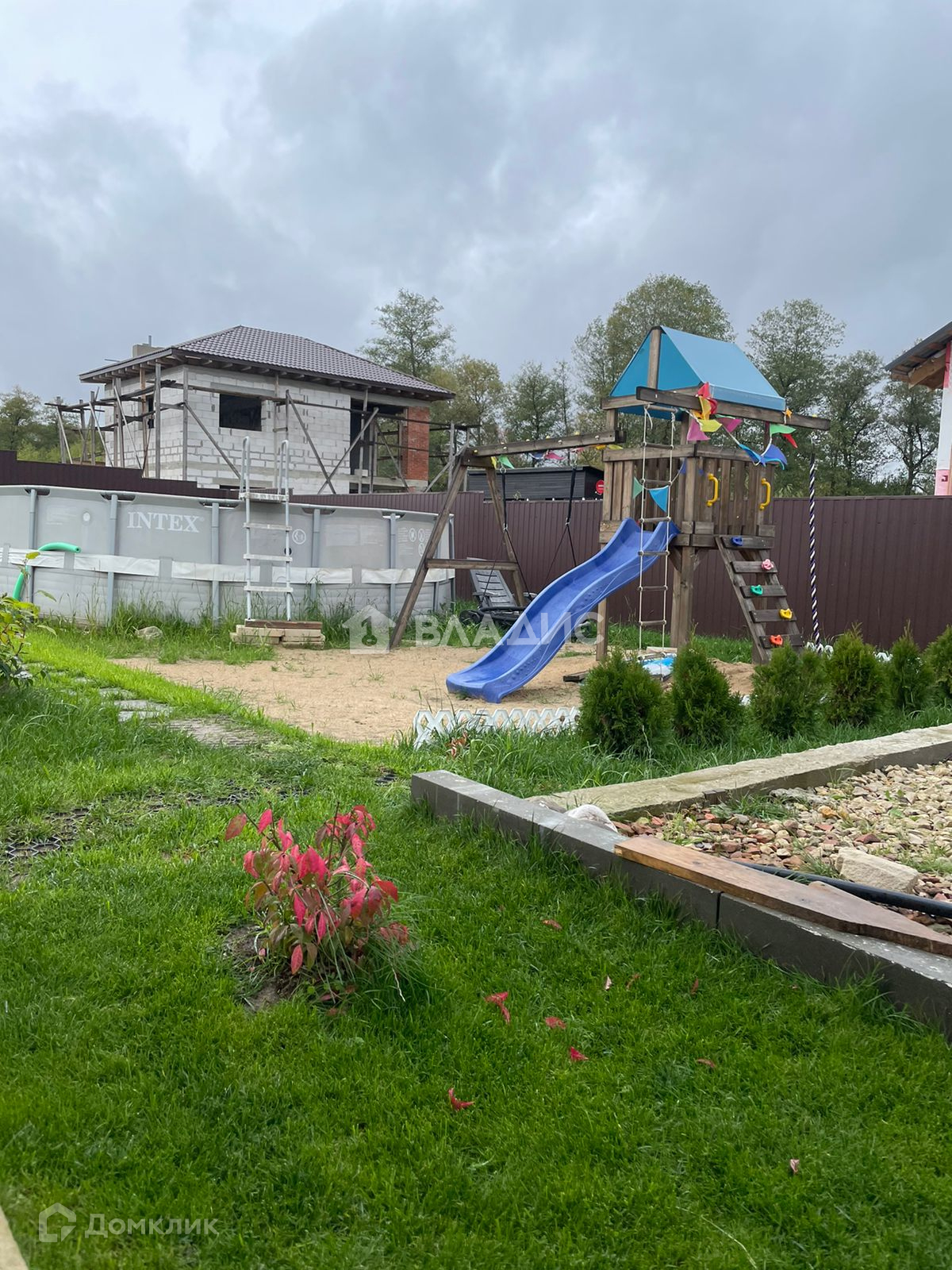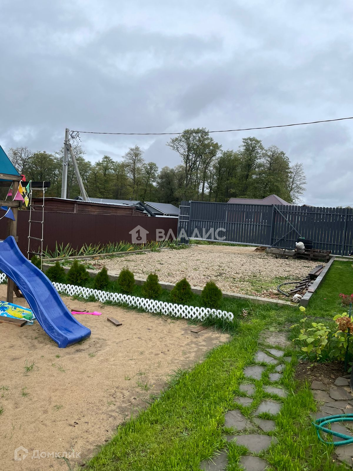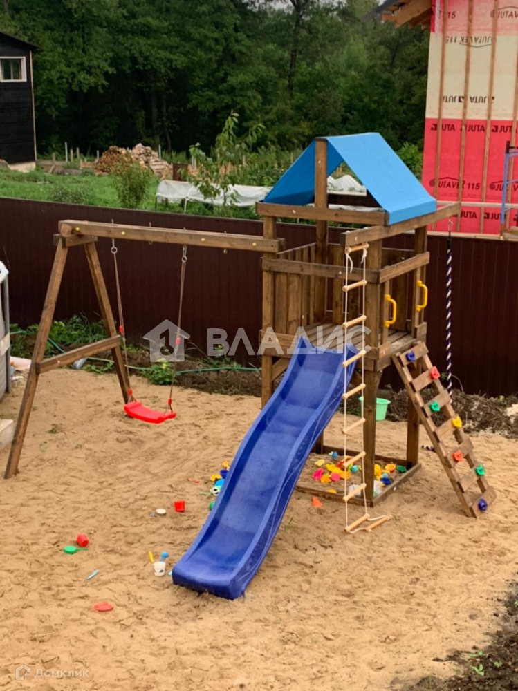 Участок 6 соток, ухожен, усеян газоном и различными плодоносящими деревьями, розами, кустарниками и туями, есть деревянный детский городок.