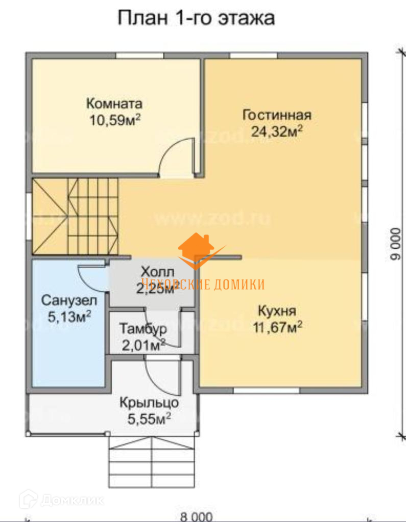 1 этаж: крыльцо, тамбур, холл, санузел, кухня, гостиная, спальня.