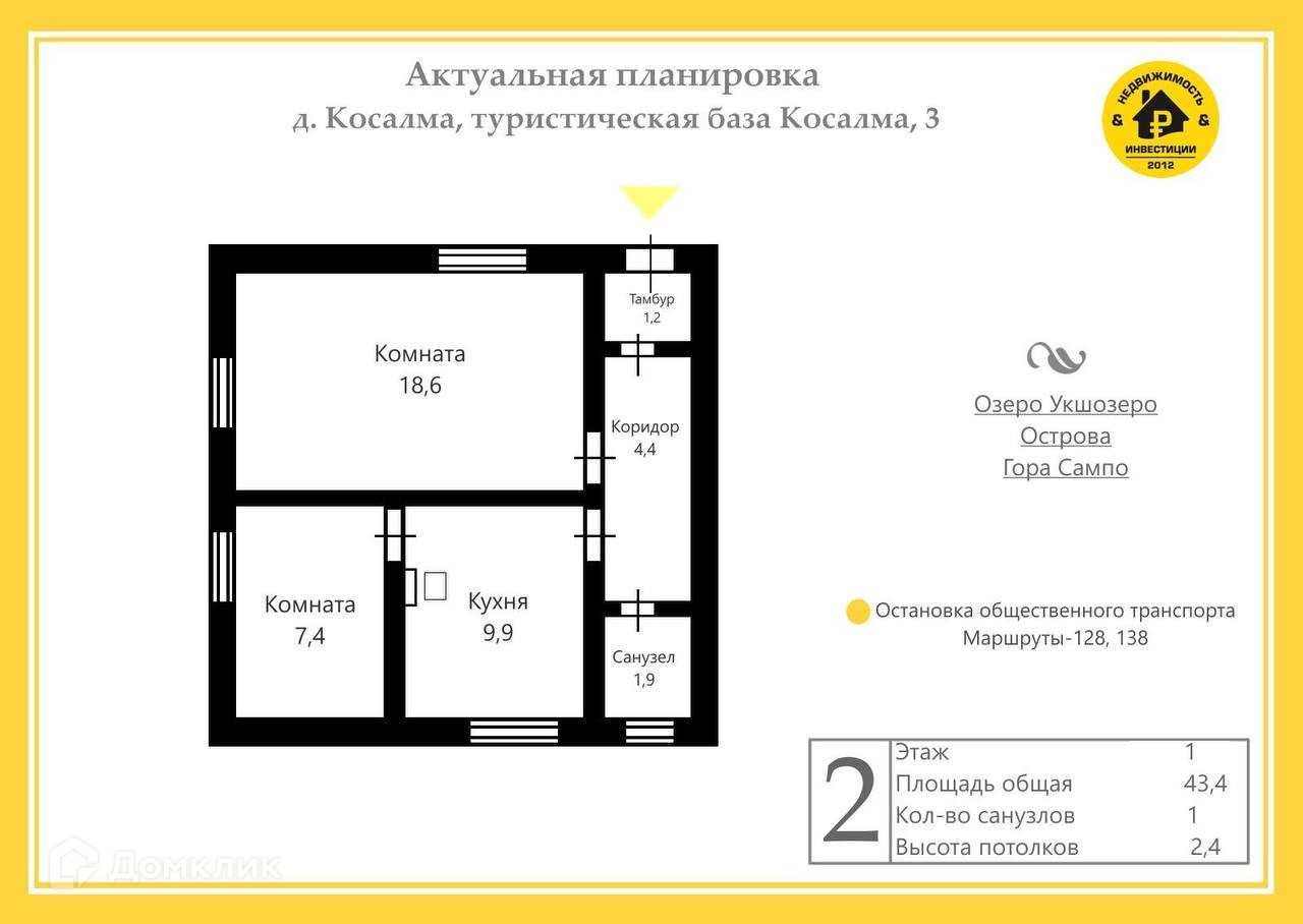 2-комнатная квартира, 45 м2, этаж 1 / 1, на продажу в деревне Косалме, деревня Косалма, 3