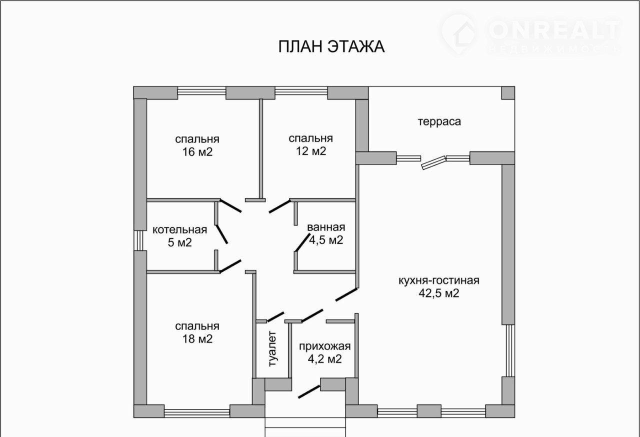 Три спальни правильной формы от 12 кв.м., санузел и котельная.